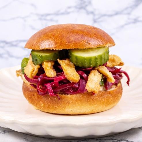 Frikadelle sandwich med pandestegte frikadeller, hjemmelavet rødkål, råsyltet agurker, og mayo - what’s not to like