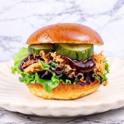 Pulled pork af Dansk Bertels gris, salat, mild senneps mayo, BBQ, Coleslaw og råsyltede agurker