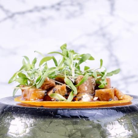 Marineret Steak med teriyaki sauce, salsamayo, serveret på nordisk flatbrød