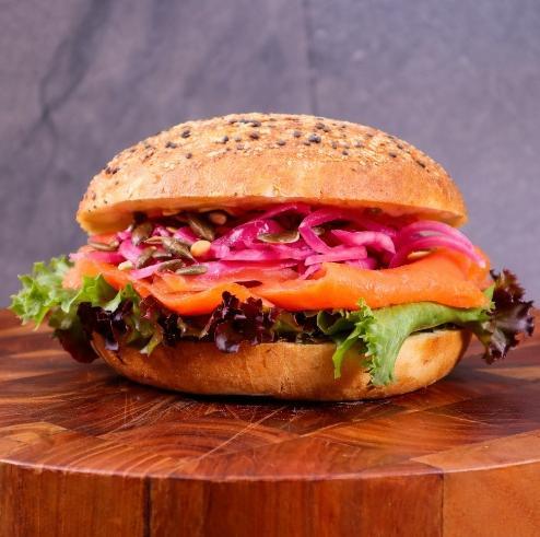 Grand Cru røget laks, med mayo, hjemmesyltet rødløg, ristede græskarkerner og salat