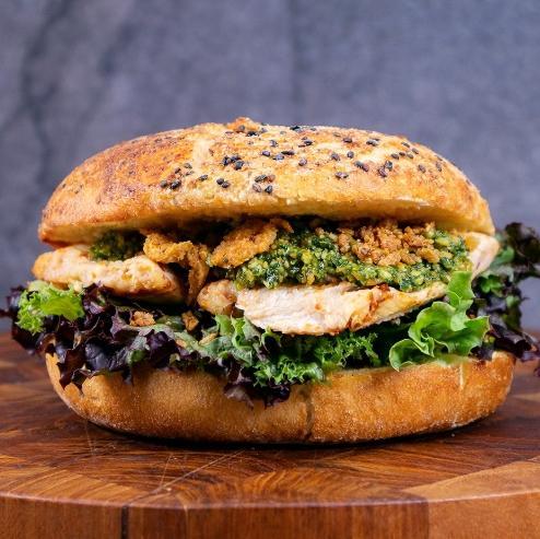 Grillet kyllingefilet, basilikum pesto, salat, sprødt kyllingeskind og mayo