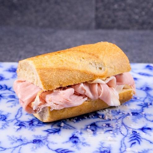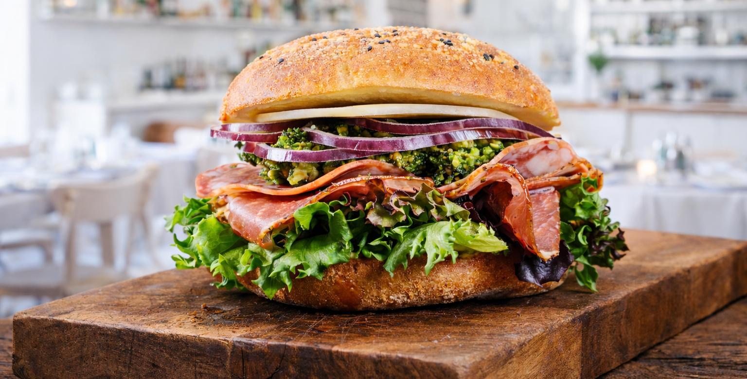 Dansk Coppa af krydret, tørret og røget grisenakke, fennikel salami, hjemmelavet pesto, chili/hvidløgsmayo, friske rødløg og
