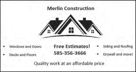 HEALTH JUNK CLEANOUT JUNKCLEANOUTSERVICES: Rates startingat$49. CleanoutofAttics,Cellars, Houses,Barns,etc! Removalgarages,fences,etc. Also,Tree/BrushRemoval FastResponseTime SAMEDAYSERVICE! MasterCardorVisaaccepted. FallCOUPONSPECIAL: Expires11-30-22 JDJunk&CleanoutService, 585-719-8004 FIREPLACE/CHIMNEY SERVICES. 20newandused stovesondisplay.We’reafulllineRegencydealer. Callfor appointment.Weoffersalesand serviceonwood,gas,&pellet stoves.Chimneycleaning, crowns,liners,dampers,caps.42’ liftservice. Call/Text:585-356-5567 Email:dhw202@yahoo.com fireplaceandchimneyservice.com WATERSBASEMENT SERVICES, INC. Theonly WATER thatshouldbe in YOURBASEMENT is BOB WATERS! Waterproofing,Drain Tile,Sumps&BackupPumps, WallCracks,StoneFoundation, StructuralRepair&More! WatersBasementServices.com 585-765-3369;716-474-3898