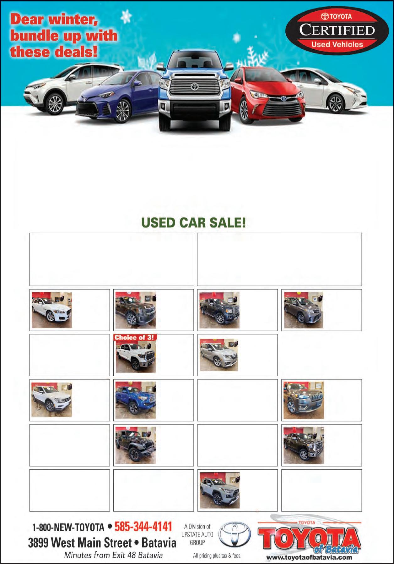 GENESEE VALLEY PENNY SAVER ● GVPENNYSAVER.COM 1-866-812-8111 BATAVIA EDITION ● FRIDAY,APRIL 19,2024 2019 FORD RANGER XLT FX4 #N23599A, 58k miles, SuperCrew $29,558 2022 TUNDRA PLATINUM #N23568A, 15k miles, power running boards $56,915 2022 TUNDRA CREW MAX LIMITED #N24295A, only 12k miles, pano roof $53,912 2021 CADILLAC XT6 #N23569B, 39k miles, premium luxury $36,439 2023 RAV4 PRIME SE #N24325A, only 6,100 miles, sunroof, heated seats & steering wheel $41,906 2019 ESCAPE SEL #N23516A, 63k miles, 4x4, loaded $17,963 2021 CHEVROLET EXPRESS 2500 #P2470, cargo van, only 57k, rare $31,557 2021 HONDA PILOT SPECIAL EDITION #N24273A, 32k miles, leather, sunroof $33,932 2021 SUBARU OUTBACK TOURING #N23251A, leather, 46k $28,900 2020 VW TIGUAN SEL 4MOTION #N23562A, 41k miles, loaded $24,541 2021 HONDA HR-V EX-L #P2496, only 7,000 miles, leather, sunroof $25,907 2021 BUICK ENCORE GX PREFERRED #P2596, AWD, 21k miles, loaded $21,521 2024 GRAND HIGHLANDER LIMITED #P2612, 5,200 miles, loaded $50,505 2021 HIGHLANDER HYBRID PLATINUM #N24021A, AWD, fully loaded, 39k $43,939 2020 HIGHLANDER HYBRID LIMITED #N24118A, 51K, loaded $37,951 2024 GRAND HIGHLANDER PLATINUM HYBRID MAX #N24297A, pano sunroof, 7,200 miles $61,907 2023 TOYOTA BZ4X #N23533B, only 12k, full electric–save thousands $30,900 2021 PRIUS PRIME XLE #N23370A, 15k miles, loaded $27,500 2021 GMC SIERRA 1500 AT4 #P2526, diesel, 66k miles, loaded, leather $46,900 2022 FORD EXPLORER ST #N24151A, 24k miles, loaded $44,524 2020 HYUNDAI IONIQ SEL HYBRID #N24227A, 43k miles $19,543 2022 MINI COOPER SE #N23586A2, 11k miles, full electric! $24,500 2015 BUICK VERANO #N24209A, only 64k miles $11,964 2021 SUBARU ASCENT PREMIUM 4X4 #P2579, 22k miles $29,900 2024 Rav4 Prime XSE 1 left at $50,963 2024 Camry SE 4 in stock starting at $31,043 #N24277 2024 Corolla Hybrid Nightshade AWD $31,159 #N24323 2024 Tundra TRD Sport Premium $62,517 #N24035 10 Tundras Available! #N24091