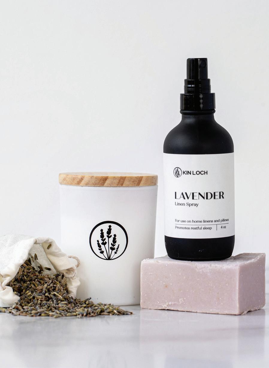 On Saturdays at the Lewiston Farmers’ Market, you can find Kin Loch Farmstead’s most popular item – lavender lemonade. Alex Plante, who has always loved lavender, sees it as a multi-faceted plant. It is a shrub, herb, and flower that looks beautiful in a bouquet, has stressrelieving elements, and can be used in cocktails and frosting for a floral taste. Lavender derives from the Latin word “lavare,” meaning to wash or purify, and is used in cleaning and perfuming agents. From this love, Alex and her husband, Ryan, founded a 45-acre soy farm in Cambria. They built an event barn, planted 2,000 lavender plants, and opened Kin Loch Farmstead in July 2019.