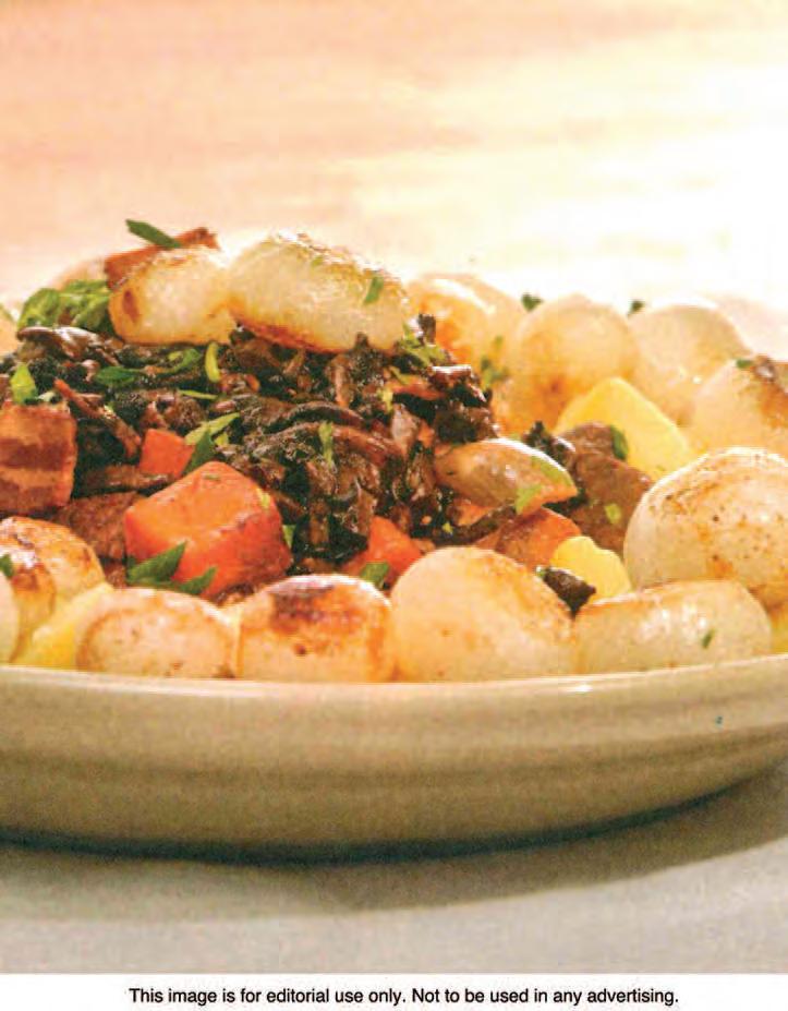 7. Serve the stew in bowls, garnished with the pearl onions, mushrooms and potatoes.