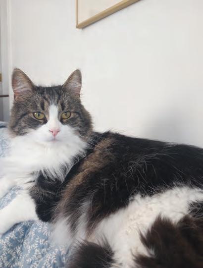 is a 3 year young Norwegian Forest Cat. As a “Wedgie” she’s still a kitten, growing until age 5. Luna has a squeak instead of a meow. She is a large breed cat and weighs about eighteen pounds.