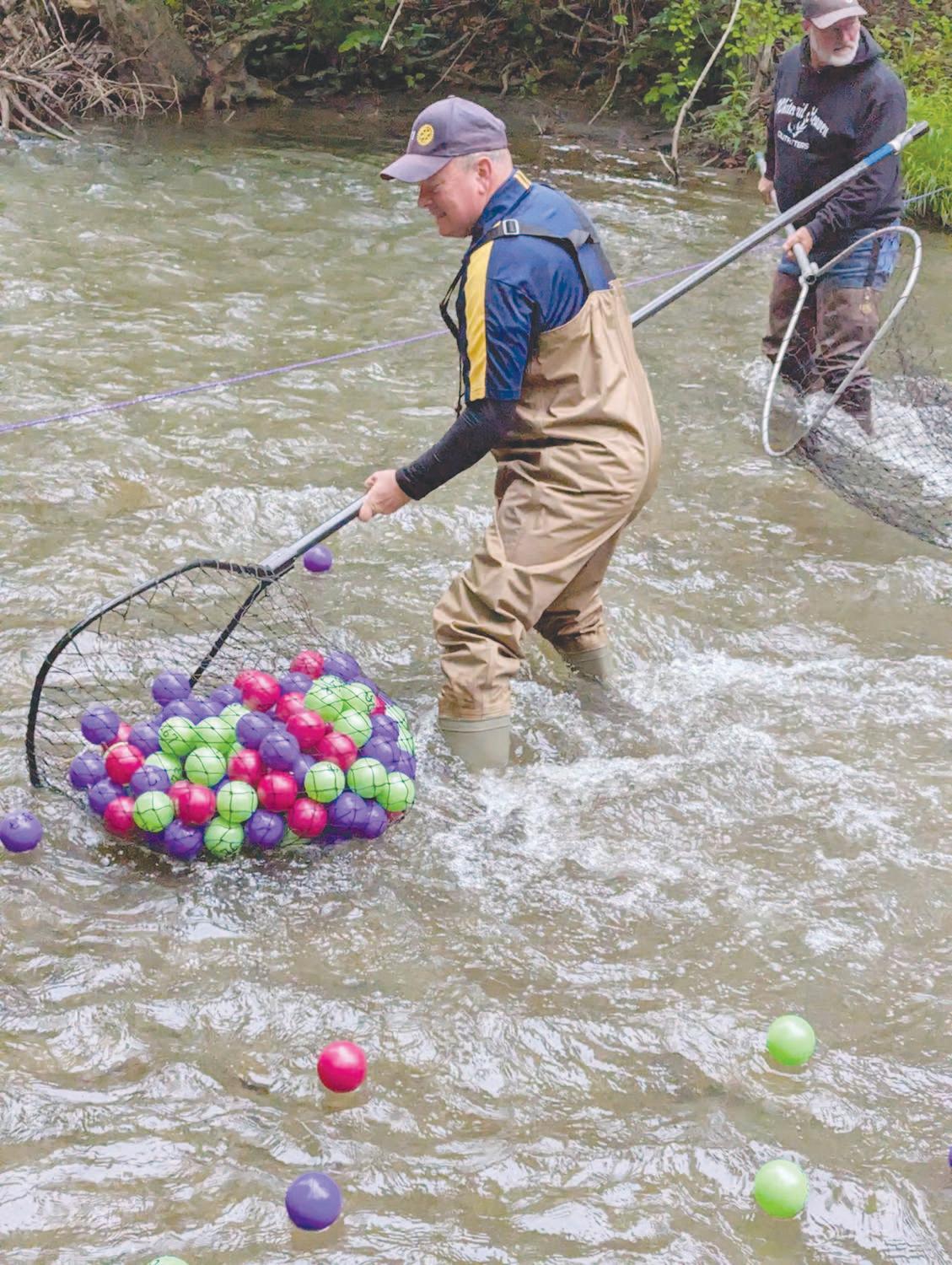 A er the first prize winner, the next five runners-up get $100 each. With 800 grapes to race, the goal is to sell all 800 tickets, which they have for the past two years. Once the balls are dumped into Naples Creek, two to three people wearing waders walk behind the grapes to ensure the balls don’t get stuck in any branches. “We don’t want to put any more plastic in our beautiful waters here, and we do our best to recover every ball we dump in,” Gordon says. At the finish line, more Rotarians in waders collect the balls.