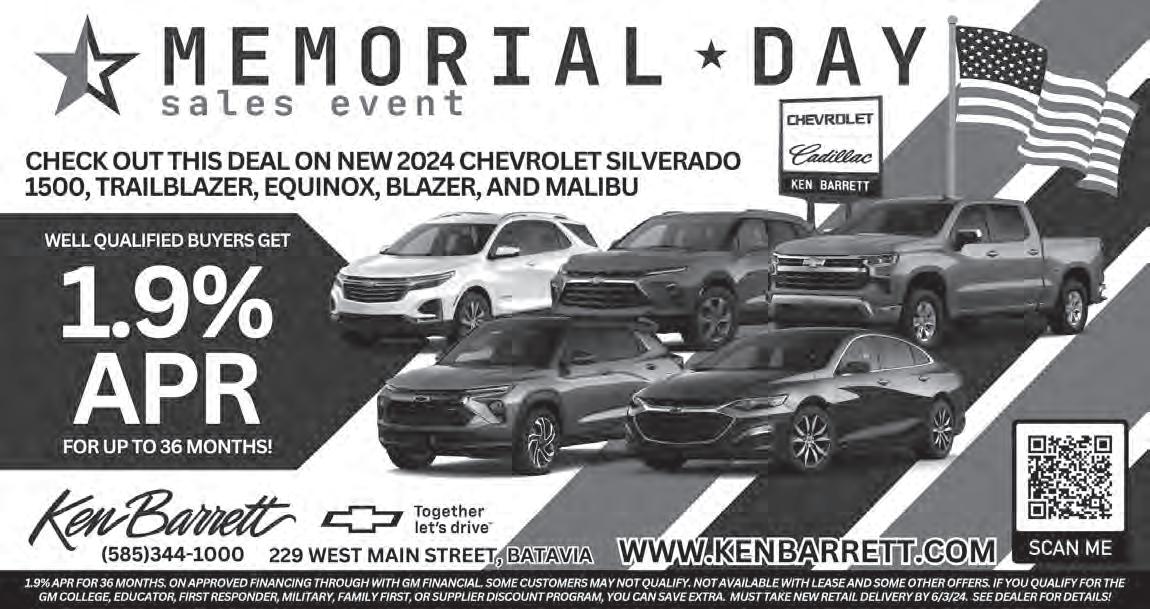 A publication of featured MEDIA May 24, 2024 | OATKA | 585.226.8111 | GVPENNYSAVER.COM Parts & Service Hours: Mon.-Fri. 7:30am-5:30pm Sales Dept. Hours: Mon., Tues. & Thurs. 8:30am-7pm Wed. & Fri. 8:30am-5:00pm; Sat. 9am-3pm Or Make An Appointment Jim Barnard Chevrolet 7101 Buffalo Rd. (Rt. 33), Churchville, NY (585) 293-2120 View more on barnardchevy.com Must take delivery by 5/31/24. Prior sales excluded. All prices are plus tax, title, lic & reg. Advertised vehicles may be subject to open safety recalls. Go to safecar.gov or contact dealer for more info. *Length of contract limited and varies by model. Must finance with GM Financial. Some customers may not qualify. Not available with some other offers. Must take delivery by 5-31-24.