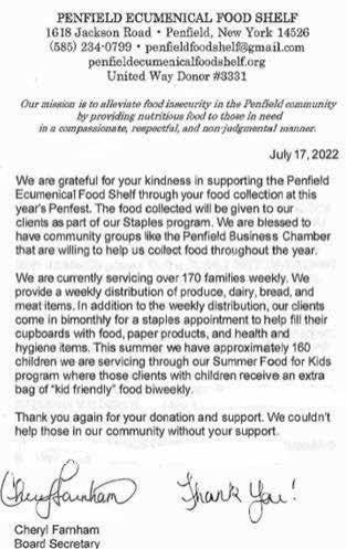 We are grateful for your kindness in supporting the PenfieldEcumenical Food Shelf through your food collection at this year’s PENFEST. The food collected will be given to our clients as part of our Staples program. We are blessed to havecommunity groups like the Penfield Business Chamber that are willing to help us collect food throughout the year.We are currently servicing over 170 families weekly. We provide a weekly distribution of produce, dairy, bread and meat items. In addition to the weekly distribution, our clients come in bimonthly for a staples appointment to help fill their cupboards with food, paper products, and health and hygieneitems. This summer we have approximately 160 children we are servicing through our Summer Food for Kids programwhere those clients with children receive an extra bag of “kid friendly” food biweekly.