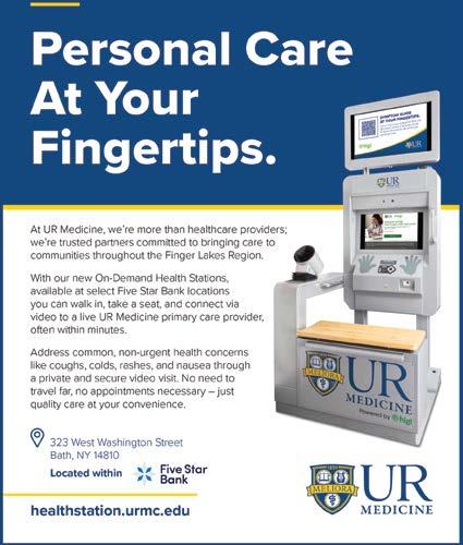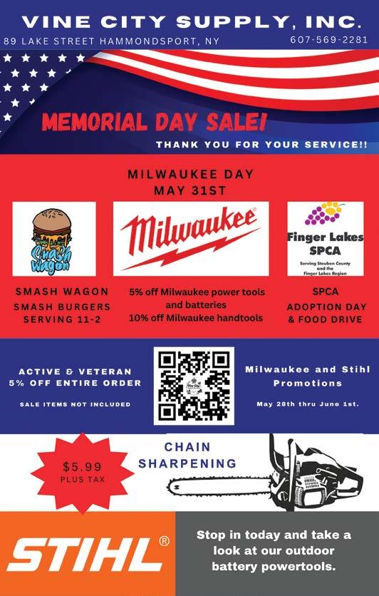 1430 miles, comes with bush buggy dump trailer and ramp. $2,500.00. Phone 607-622-5445. DONATE YOUR CAR TO VETERANS TODAY!: Help and support our veterans. Fast - FREE pick up. 100% tax deductible. Call 1-800-245-0398. Mon., May 27th • 10:30 AM Avoca Methodist Church COMPLETE DINNER: $12.00 1/2 Chicken, Salt Potatoes, Rolls, Baked Beans & Cookie 8593 JACOBS LADDER RD • AVOCA 11:00AM - 1:00PM C H IC KE MONDAY, MAY 27TH ANNUAL MEMORIAL DAY TAKE OUT ON LY ! ! PRESALE TICKETS AVAILABLE - CALL 607.566.4045 AND A FEW TICKETS AVAILABLE AT THE DOOR! Methodist IT’S THAT TIME! 125 SENECA STREET EXT. GOODRICH SMITH VFW POST #8649 DU N DEE V F W PRE ORDERS, CALL 60 7.243.8669 CHICKEN BBQ ME MORIAL DAY 12:00PM to 1:30PM U V $12.00 PER DINNER M AY 25 $6.00 HALVES ME DAY CHICKEN BBQ SATURDAY 25TH Dinner Includes Half Chicken, Salt Potatoes, Baked Beans & Fresh Roll 8:00 AM - 2:00 PM Saturday, June 1st 35 LAKE STREET • HAMMONDSPORT Inside HAMMONDSPORT METHODIST CHURCH HOT DOGS AND DRINKS FOR SALE!! I n s id e Saturday, June 1st 8:00 AM - 2:00 PM Social Hour • Dinner Awards • 50/50 Raffle FOR RESERVATIONS Email any questions to: ddeats13@gmail.com Alumni Banquet 607.377.0003 HAVERLING ALUMNI ASSOCIATION Strengthening The Future By Connecting Our Past Alumni Banquet Friday, June 14, 2024, 5:30PM Bath American Legion CELEBRATION HAVE A HEALTHY AND SAFE HOLIDAY THANK YOU TO ALL SERVICE MEMBERS! PARADE AND MEMORIAL DAY SERVICES HELD IN THE GLEN VIEW CEMETERY! monday, may 27 , 202 4 12:0 0 PM TOWN OF PULTENEY Annual TOWN OF PULTENEY Annual GUEST SPEAKER: Steuben County Historian, Griffin Bates “Soldiers’ Graves In Glen View Cemetery” monday, may 27 , 202 4 12:0 0 PM 82 80 St Route 54 Hammondsport, NY 6 0 7 . 56 9 . 2 8 4 4 Breakfast Sandwiches • 7” Breakfast Pizzas • Breakfast Tornados BREAKFAST AVAILABLE DAILY SUN.- THURS. 4:30 AM - 9:00 PM • FRI. - SAT. 4:30 A M - 10:00 PM LAKES GAS NY LOTTO SCRATCH OFF GAMES - STOP IN & PLAY! PIZZA SPECIALS SHEET CHEESE PIZZA $22.69 + TAX Additional Toppings $3 each LARGE CHEESE PIZZA $13.69 + TAX Additional Toppings $2 each Hot Foods Stop One Hour Before Close FRESH MADE HOT & COLD SUBS HALF $6.99 + TAX WHOLE $11.99 + TAX * Roast Beef Extra Charge Subs Made From Open to Close Monday Chicken Breast Sandwich $4.99 Tuesday Buffalo Chicken Logs $1.49 Wednesday Chicken Cordon Bleu Bites $2.59 Thursday Hambugers $4.59 Friday Half Philly Cheesesteak Sub $7.99 REGULAR, DECAF, AND FLAVORED EIGHT O’CLOCK * TAX ADDED TO ALL PRICES! Monday Chicken Buffalo Chicken Logs Bites Hambugers $4.59 Friday Half Cheesesteak Sub $7.99 SAT URDAY, M AY 2 5 T H • 12PM-6PM SAT M AY 5 T H • BROUGHT TO YOU BY THE HORNELL PARTNERS FOR GROWTH BUSINESSES DOWNLOAD THE APP TODAY 40 MAIN STREET GRASS AREA • HORNELL GRASS HORNELL 10TH ANNUAL CRAFT AND FOOD VENDORS DJ TRUTH • FAMILY PHOTO AREA KIDS GET A FREE TAKE HOME BUILD A BIRDHOUSE AND MUCH MORE FOR THE WHOLE FAMILY Hammondsport Art Show 56TH ANNUAL Saturday, July 13 Art 56TH ANNUAL Sunday, July 1 4 www.hammondsportartshow.com FOR MORE INFORMATION: 607-776-7774 On the Village Square In Hammondsport Painting, Pottery, Photography, Sculpture 10:00 AM - 5:00 PM EACH DAY July 13 the In Painting, Pottery, Photography, Sculpture