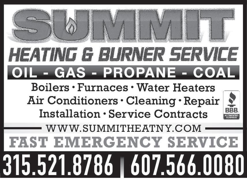 HEATING&COOLING: Werepairandserviceall typesofoilandgasheating systems.Boilers,furnaces, waterheaters,residential/ mobilehomes.Oilheatservicecontracts,A/Ccleaning &repair.Fastservice,honest advice,guaranteedwork.7 dayemergencyservice. VISA/MC.MemberBBBof WNY.CallSUMMIT BURNERSERVICE 315-521-8789, 607-566-0080.www. summitheatny.com