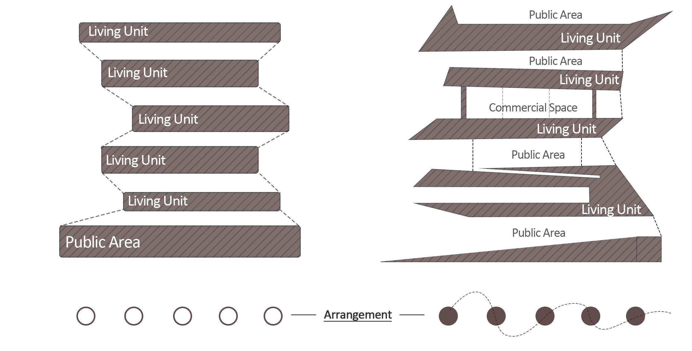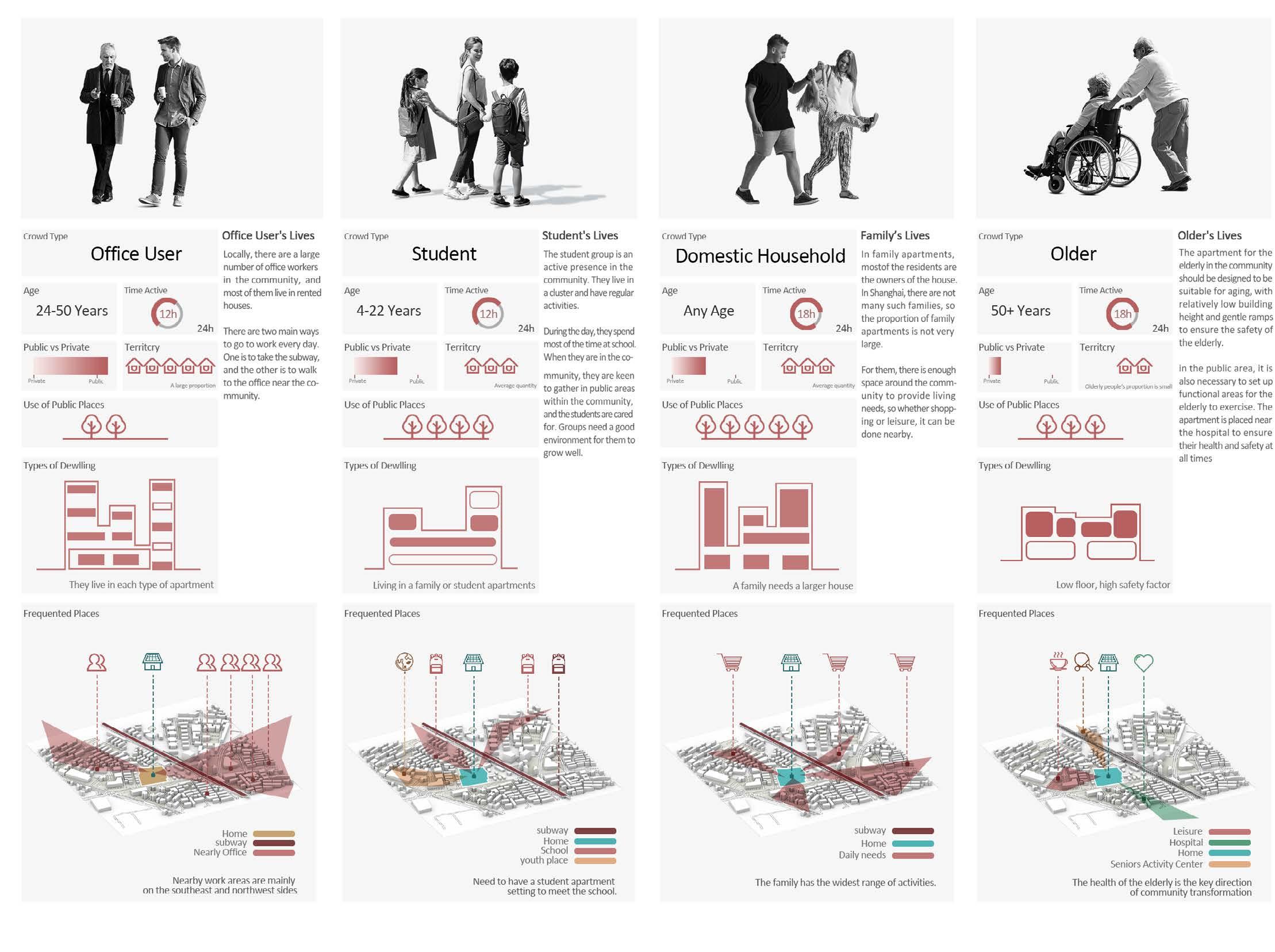 The six types of flats are divided into nine and arranged on the site according to crowd information to complete the community centre.