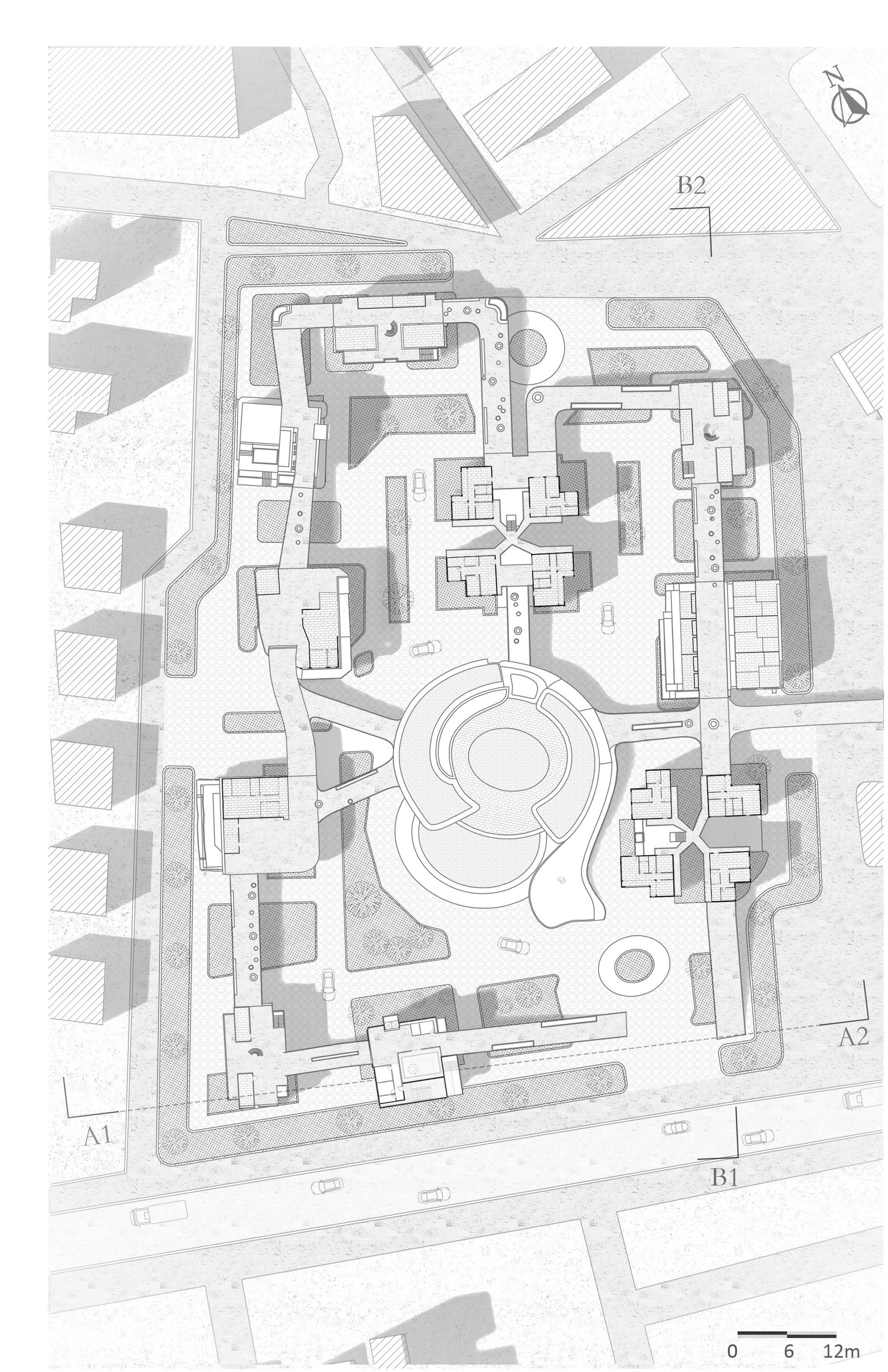 After the terrain is lowered, the building is placed in a low-lying position below which is an open fieldentertainment area, one level above the horizon, with the height between each level gradually decreasing as the elevation rises, to match thelimitations of the building's form.