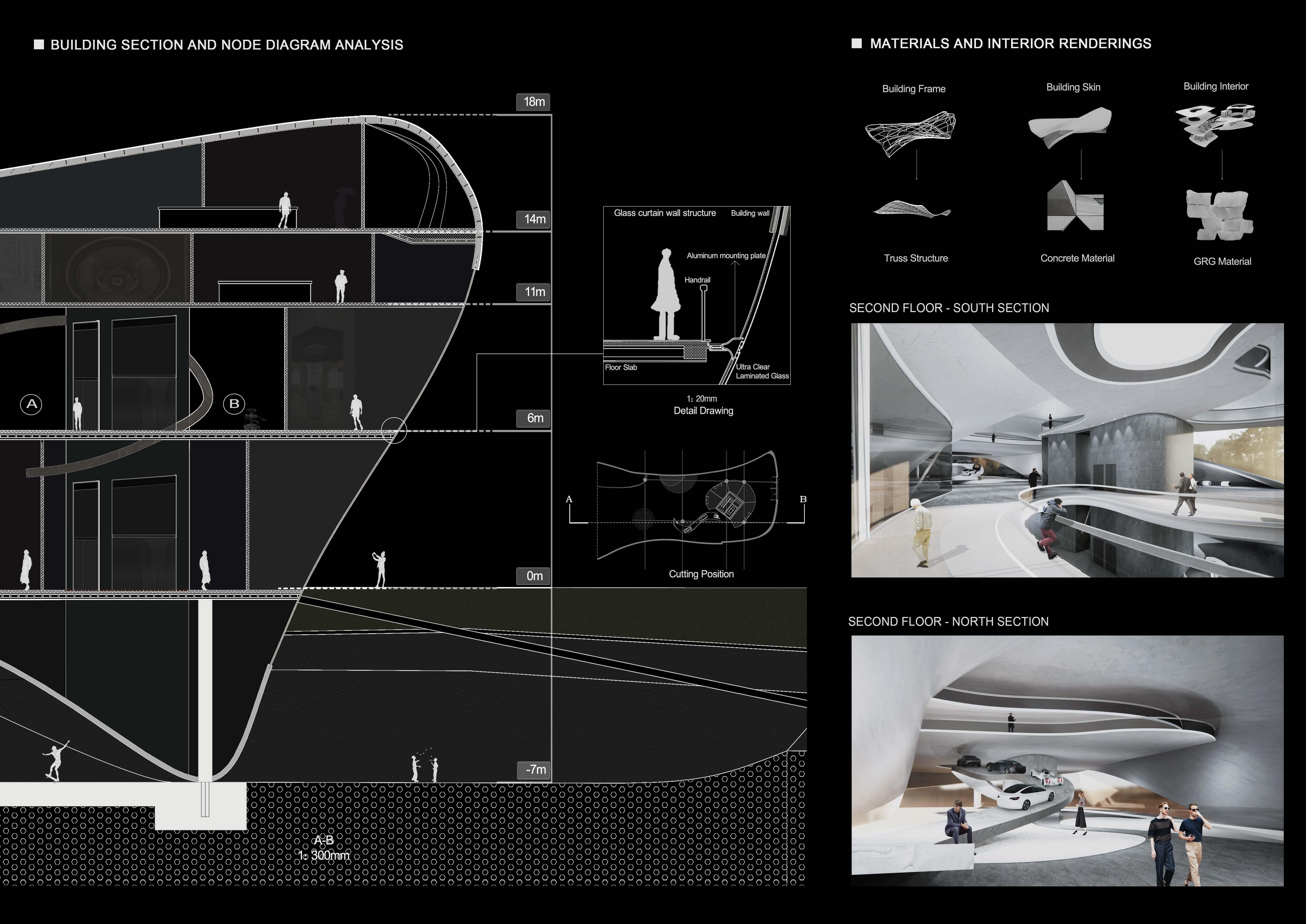 The shape of the building is inspired by the Venturi effect of the car installation, and is complemented by aerodynamic visualization to complete the architectural form.