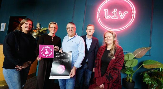 Die Bielefelder Oberbürgermeisterin Dr. Christiana Bauer unterstützt das Programm und freut sich mit den Beteiligten (von links nach rechts): Bianca Donschen von der Polizei Bielefeld, Wolfgang Niewald, stellvertretener Polizeipräsident, Ivo Klumpp Clubbetreiber Stereo und Cocktailbar LIV sowie Präsidium DEHOGA Ostwestfalen, Dr. Christiana Bauer und Sonja Bergenthal, Psychiatriekoordination
