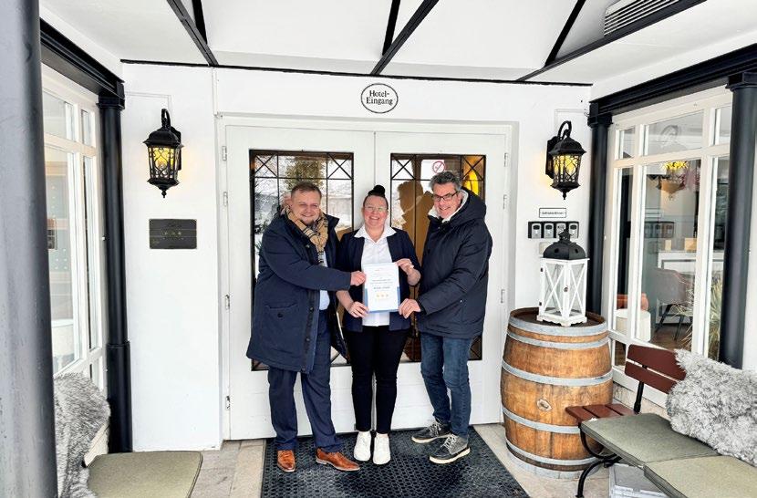 Schieder: Betriebsinhaber Marius Leifeld (links) und Betriebsassistentin Alice Klaas (Mitte) nahmen die Klassifizierungsurkunde zur Auszeichnung Drei-SterneSuperior von Kai Buhrke (rechts), Geschäftsführer des DEHOGA Lippe, entgegen. Die Auszeichnung ist zugleich eine Anerkennung für die Investitionen in die Modernisierung des Hauses, mit denen Komfort, Ausstattung und Service deutlich aufgewertet wurden