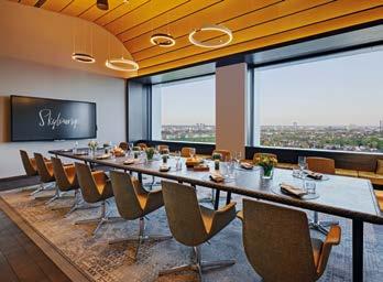lange Öffnungszeiten. Wie zeitgemäßes Training im urbanen Businesshotel aussehen kann, zeigt etwa das b’mine Frankfurt Airport. Das Haus setzt auf ein hochwertig ausgestattetes Gym mit funktionalem Equipment aus TechnoGym-Geräten und klarer Designsprache – eingebettet in ein Gesamtkonzept, das Bewegung als selbstverständlichen Bestandteil des Aufenthalts versteht. Das Hotel ermöglicht zum Beispiel in 40 von 241 Zimmern die Mitnahme des eigenen Fahrzeugs. Generell ist das Hotel eine ideale Location, Stress und Hektik zu vergessen. Das zumindest war die planerische Absicht der Innenarchitekten Cord und Rolf Glantz, Geschäftsführer von Geplan Design. Neben der Gestaltung der Zimmer entwarfen die Innenarchitekten auch das Foyer, den Eventbereich sowie das Restaurant.