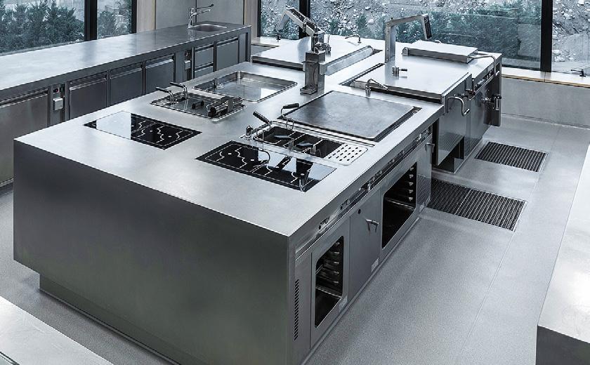 Unter Berücksichtigung der Anforderungen sowie der besonderen Architektur wurde von Ambach, dem Hersteller von professioneller Kochtechnik, in Kooperation mit Niederbacher eine individuelle Lösung entwickelt: Ein Herdblock mit einer durchgehenden fugenlosen Hygieneabdeckung, der sämtliche Kochgeräte, zusätzlich zwei Ambach IQ (elektrische multifunktionale KippDruckbrasieren), enthält.