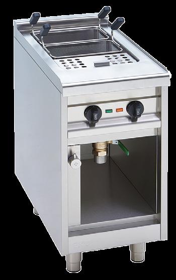 Mit einer Gerätebreite von 400 Millimetern meldet sich der Elektro-Nudelkocher von EKU zurück. Zudem beheizt das Alu-Heizkern-System indirekt das maßgeschneidert isolierte Becken, das aus rostfreiem Edelstahl besteht. Ferner überzeugen eine stufenlose Temperatureinstellung sowie eine Was-