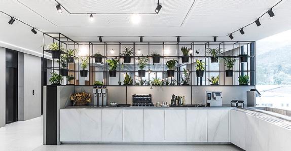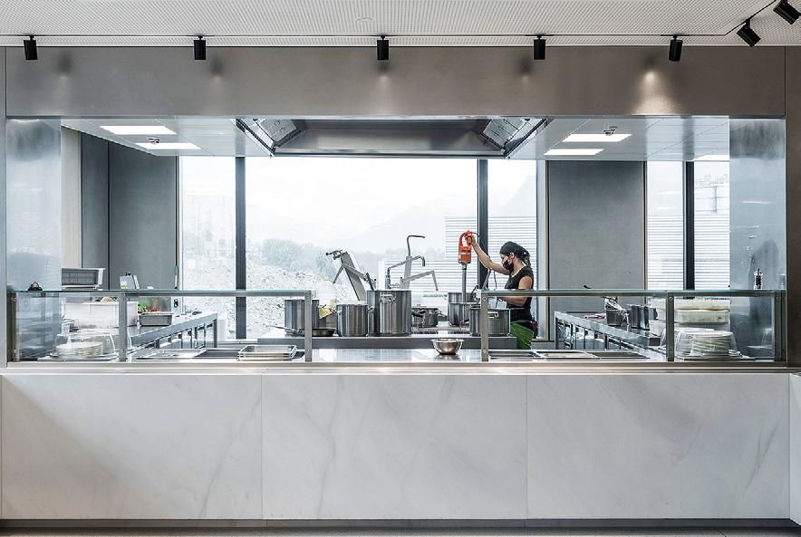 „Die Anforderungen waren hoch: Optimale Arbeitsabläufe, optimale Hygiene sowie nachhaltige, energie- und ressourcensparende Prozesse“, erklärt Thomas Krismer, Senior Consultant Partner bei Niederbacher, einem Unternehmen für Planung und Konzeption im HorecaBereich. Aber auch die Ansprüche an Optik und Ausführung waren sehr speziell: Materialien wie Zement, eine Anspielung auf das Kerngeschäft von PROGRESS, Edelstahl und Spezialoberflächen wie Marmor und Holz im Büfettbereich sollten als besondere Elemente das Design der Küche unterstreichen.