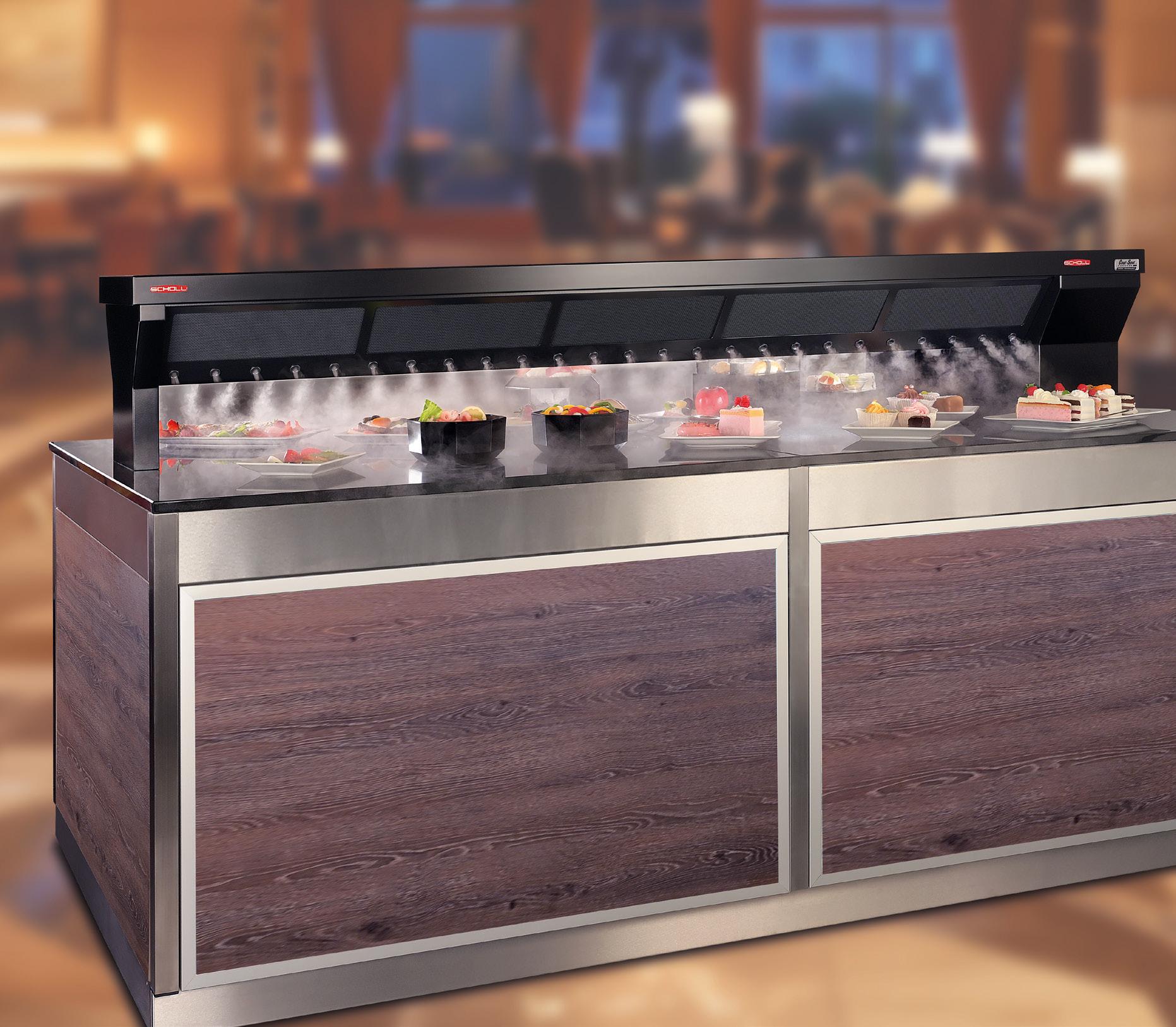 Das System des Unternehmens aus Bad Marienberg erzeugt direkt über den Speisen eine „clean cool cloud“ mit vier bis sechs Grad Celsius und 95 bis 98 Prozent Luftfeuchtigkeit. Produkte bleiben unter der HACCPGrenze von sieben Grad Celsius, trocknen nicht aus, bilden keine Kondensation und können nach dem Service wieder in die Kühlung zurückgeführt werden. So sinken Lebensmittelabfall und Wareneinsatz. Ein zentraler Vorteil: Das CoolSpot kommt ohne Kältemittelkreisläufe aus. Damit entfallen gesundheitsgefährdende LeckageRisiken, Nachfüllungen und kältemittelbezogene Entsorgung – der Betrieb wird einfacher und nachhaltiger.