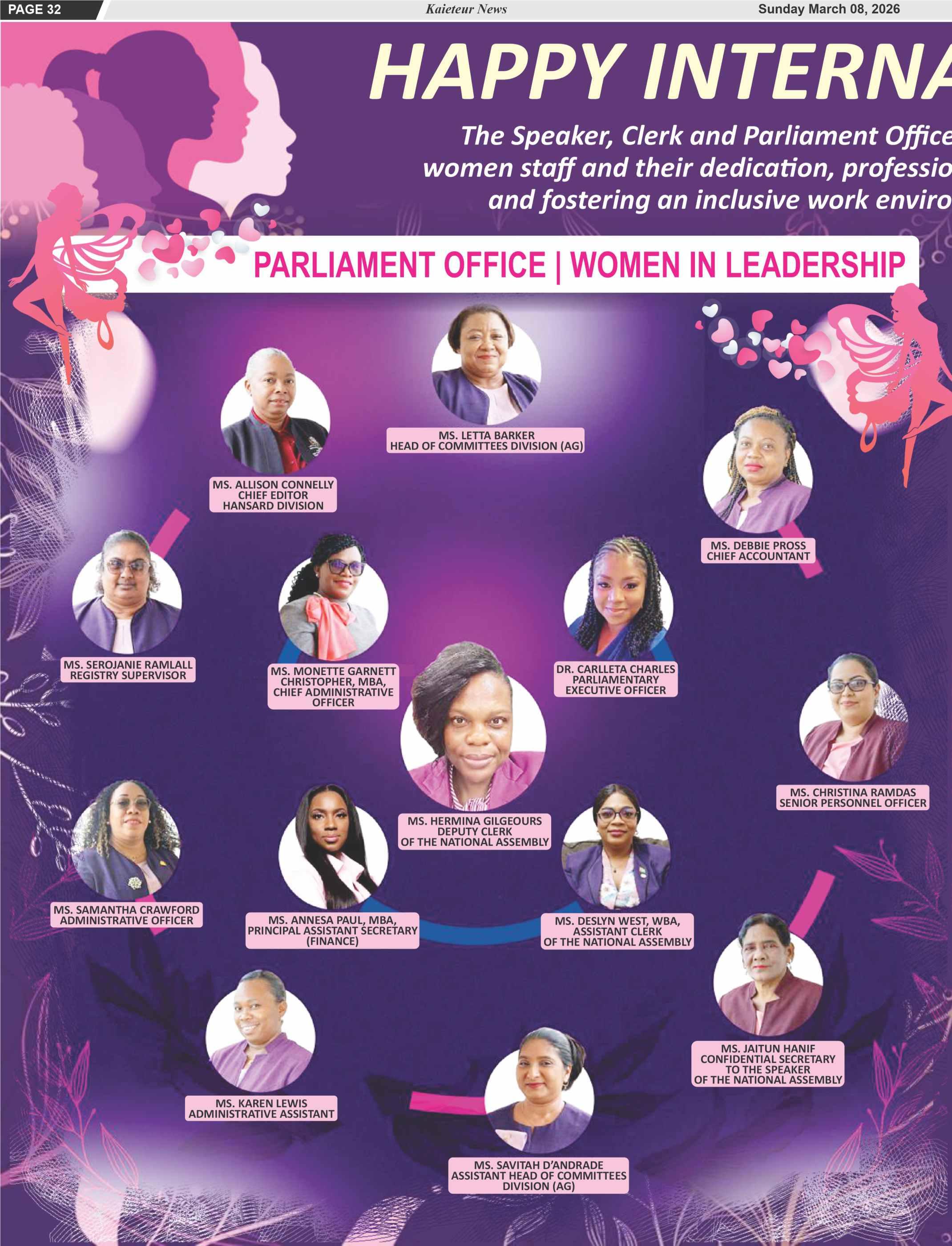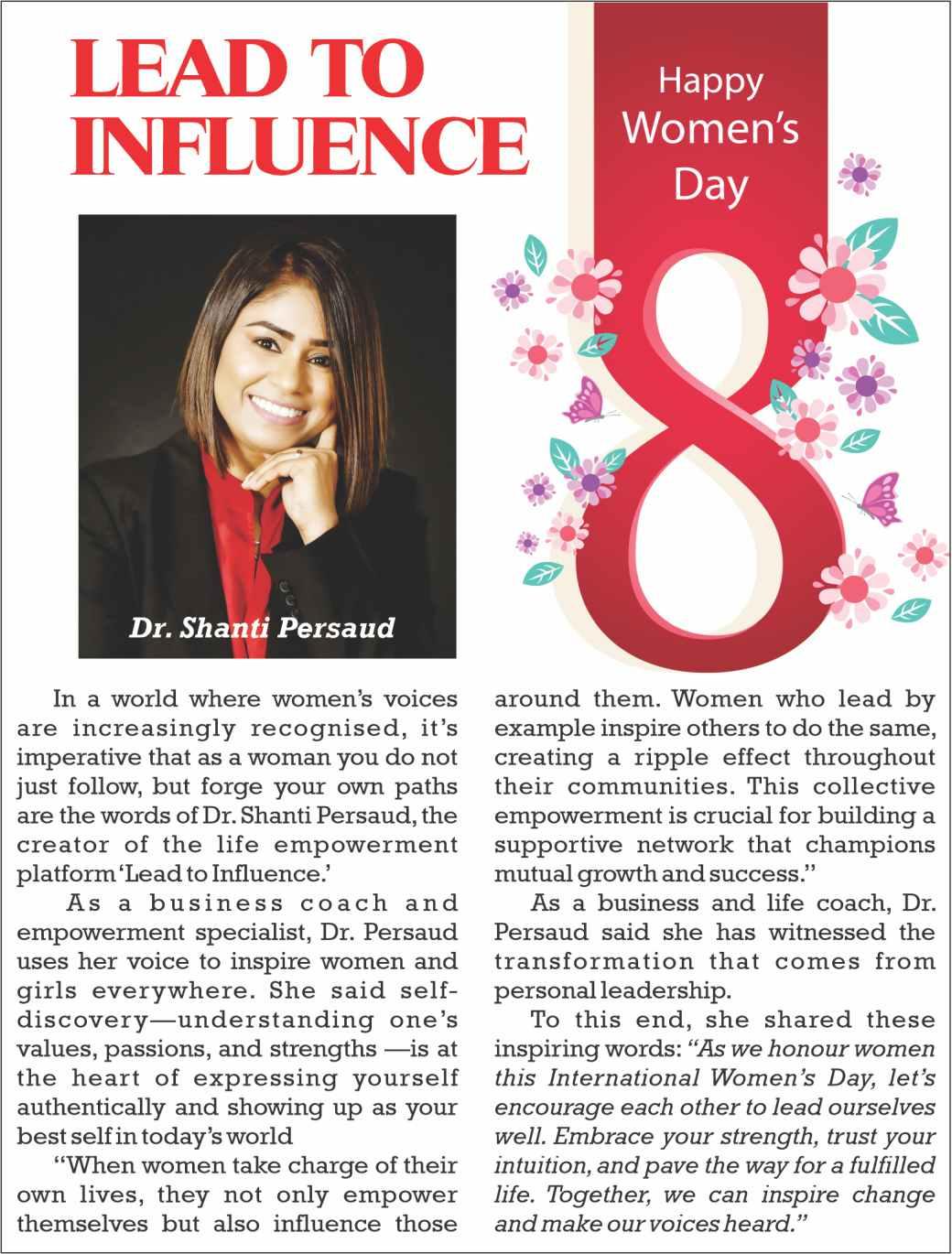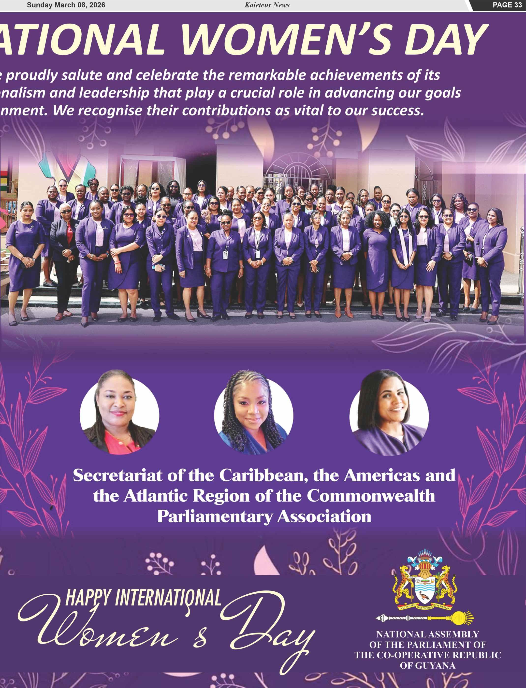 In this region, one not without its gender prejudices, from Janet Jagan to Mia Mottley to Kamla PersadBissessar,intimespastandpresent,haverisentothetopina professionwheretheplaceofmenistakenforgranted,and that of women is seen as a rarity, if not an abnormality Through persistence and grit, and the confluence of circumstances,womenhavestrivenandsomeofthemhave succeededincareersfromwhichtheywerebarred,themere thoughtforbidden. Fromconstructionengineerstoairline pilots to combat soldiers, women are everywhere, have scoredhighmarks.Inmedicineandlaw,Guyanacanboast of an increasing number of female presences. A former Minister of Health (Volda Lawrence), a former acting Chancellor of the Judiciary (Yonette Cummings-Edwards) and an acting Chief Justice now acting chancellor in the presence of Roxanne George-Wilshire have made Guyanese proud by their strides that took them high. Thoughnationalelectionsarenowjustoversixmonthspast, a woman is said to be in the forefront of the government’s vision for president of Guyana in 2030, when the next elections are due. By any yardstick, a credible claim can be madethatwomenhaveachieved Weagreeandwecommend them for their efforts in coming out of the kitchen, pushing againstthebarriers,andinchingahead Wethinkthatinching aheadisafairestimation,forthosewhohaveexcelledhaveone commondenominatorthatsetsthemapart Atthecore,inthe freerangingoftheirvisions,theywereandareoverachievers Self-confidentwomenwhobecomeself-madewomen,onesto be respected and cheered for standing out as role models for theirsimilarlyinsightfulanddrivensisters Theglassceiling that presses against the heads of women has shown signs of crackingindifferentplaces Butbynomeansshoulditbesaidto haveshatteredandcollapsed
