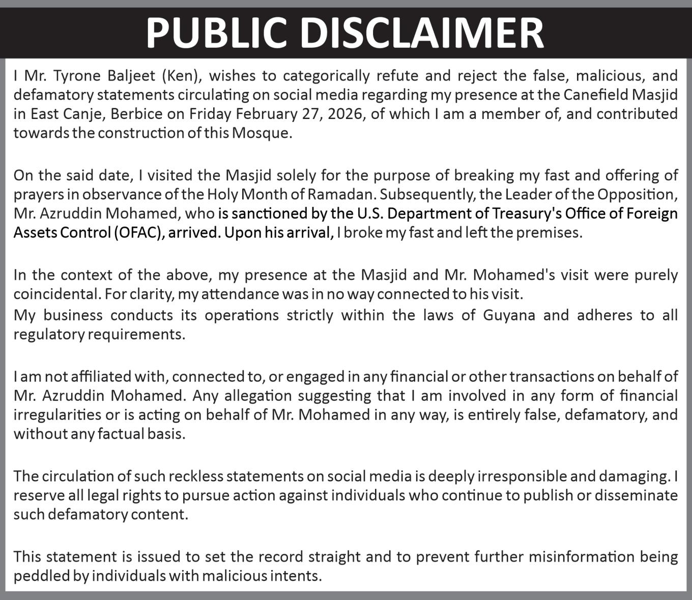 Itisimportanttosaythis withoutmalice.Mypersonal acquaintance with Manzoor Nadirisrootedinamoment when he appeared to be grappling sincerely with Guyana’s challenges and speakingthelanguageof reform That history makesthepresentcourseall the more disappointing, but it also means that I cannot simply dismiss him as irredeemably cynical. The office he holds still offers him an opportunity to recalibrate: to widen, not narrow, media access; to welcome,notblock,debates that test the robustness of parliamentary rules; and to show that the Speaker’s chair is capable of standing abovethedailypartisanfray Ifhechoosesthatpath,his legacy could yet be one of institutional strengthening ratherthanerosion Ifhedoes not, history is likely to remember him not for his earlyaspirationstowardgood governance,butforpresiding over a period in which both parliamentary openness and press freedom slipped backwards in a country that can ill afford further democraticregression Forhis sake, and for Guyana’s, one hopesherecognisesthatitis nottoolatetoactdifferently