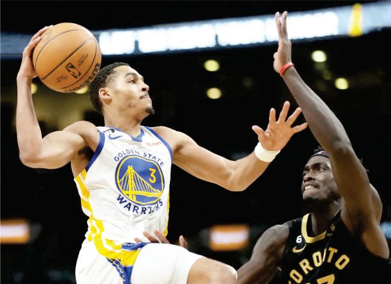 BEENAWHILE theWarriors,whoselastroad used to trying to win without Poole shot 14 for 23, a “He’s played a lot of Raptors:GGaryTrentJr Thompson and Green win came Nov 27 at him. Hopefully we’re in a career-high for made great games for us,” (left quadriceps) sat for the playedinTorontoforthefirst Minnesota. good spot when he comes baskets, and went 5 for 11 Warriors coach Steve Kerr secondstraightgame.FO.G. time since Game 5 of the “It shows how good we back.” from3-pointrange. said “If it’s not the best, it’s Anunoby (left hip) missed 2019 NBAFinals. Curry has can be,” Looney said of Curry missed his second “He was incredible on definitely one of the few hisfourthstraight. not played north of the winning without Curry “It’s straight game after injuring bothsidesoftheball,”Green best,becausehewasgreatat Before the game, coach bordersincethatseries. always going to be hard to his left shoulder in last said. bothends ” Nick Nurse said Anunoby UPNEXT win when you’re missing Wednesday’slossatIndiana. Poole topped 30 points Pascal Siakam scored 27 will likely return later this Warriors: At New York one of the best players in the The two-time MVP and for the fifth time this season points,FredVanVleethad22 week. Started7for9from tonight.
