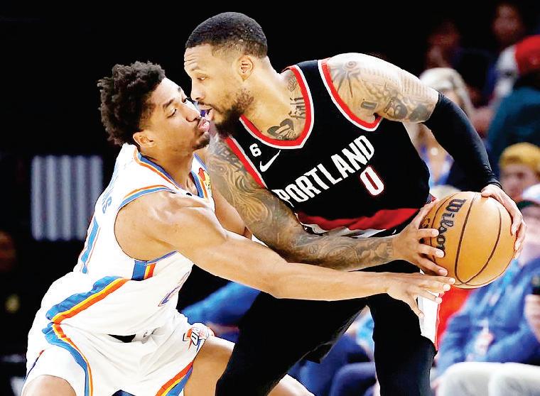 The result spoiled the Orlando scored 13 straight game-high 26 points and night for Trail Blazers star andtooktheleadonadriving Doug McDermott added 16 DamianLillard,whobecame layupbyMarkelleFultzwith off the bench as San the franchise’s all-time 3.8 seconds left. The Hawks Antonio parlayed a prolific leading scorer in the third inbounded the ball to perimeter shooting display quarter Lillardcameintothe Murray, who dribbled to the with a road victory over game needing 21 points to corner and was fouled by Houston pass Clyde Drexler as the PaoloBanchero. Vassell and McDermott leading scorer in Portland Orlando was unable to combined to shoot 16-for-28 history get off a final shot before overall and 9-for-14 on 3He tied Drexler with a 3- timeexpired. point attempts to pace the pointer early in the third Trae Young led the Spurs. frametobreaktherecord. added 26 in the loss. No more than 13 points, but six quarter before sinking a pair Hawks with 37 points, and San Antonio, which Lillard finished with 28 Thunder player other than otherOklahomaCityplayers of free throws later in the he added 13 assists for his ended a mini two-game points while Jerami Grant Gilgeous-Alexander scored scoredindoublefigures.
