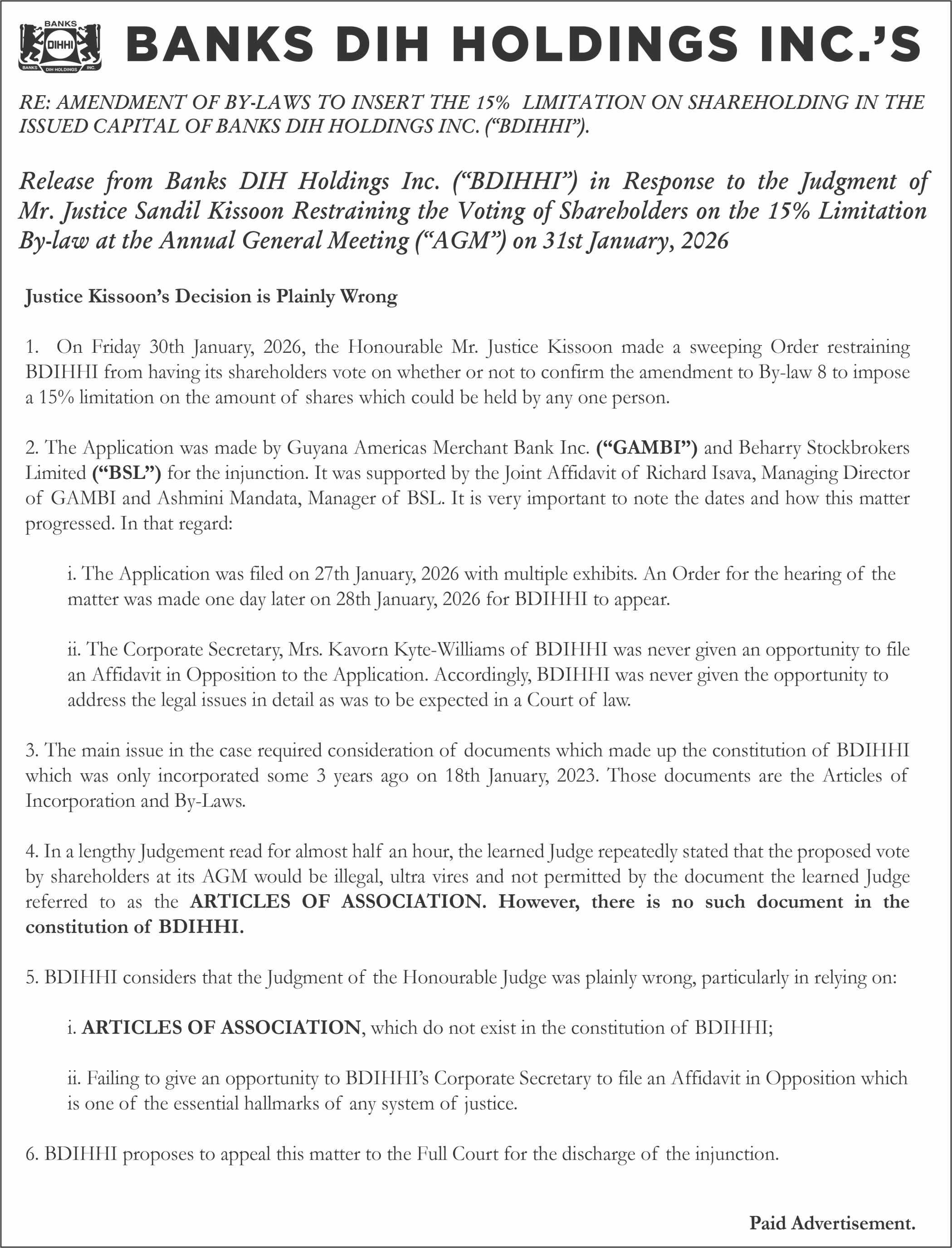 In his ruling, Justice Kissoon granted a series of interlocutory injunctions restraining Banks DIH, its directors, officers, and agents from presenting, tabling, proposing, or permitting any vote at the AGM to confirm or give effecttothenewby-law