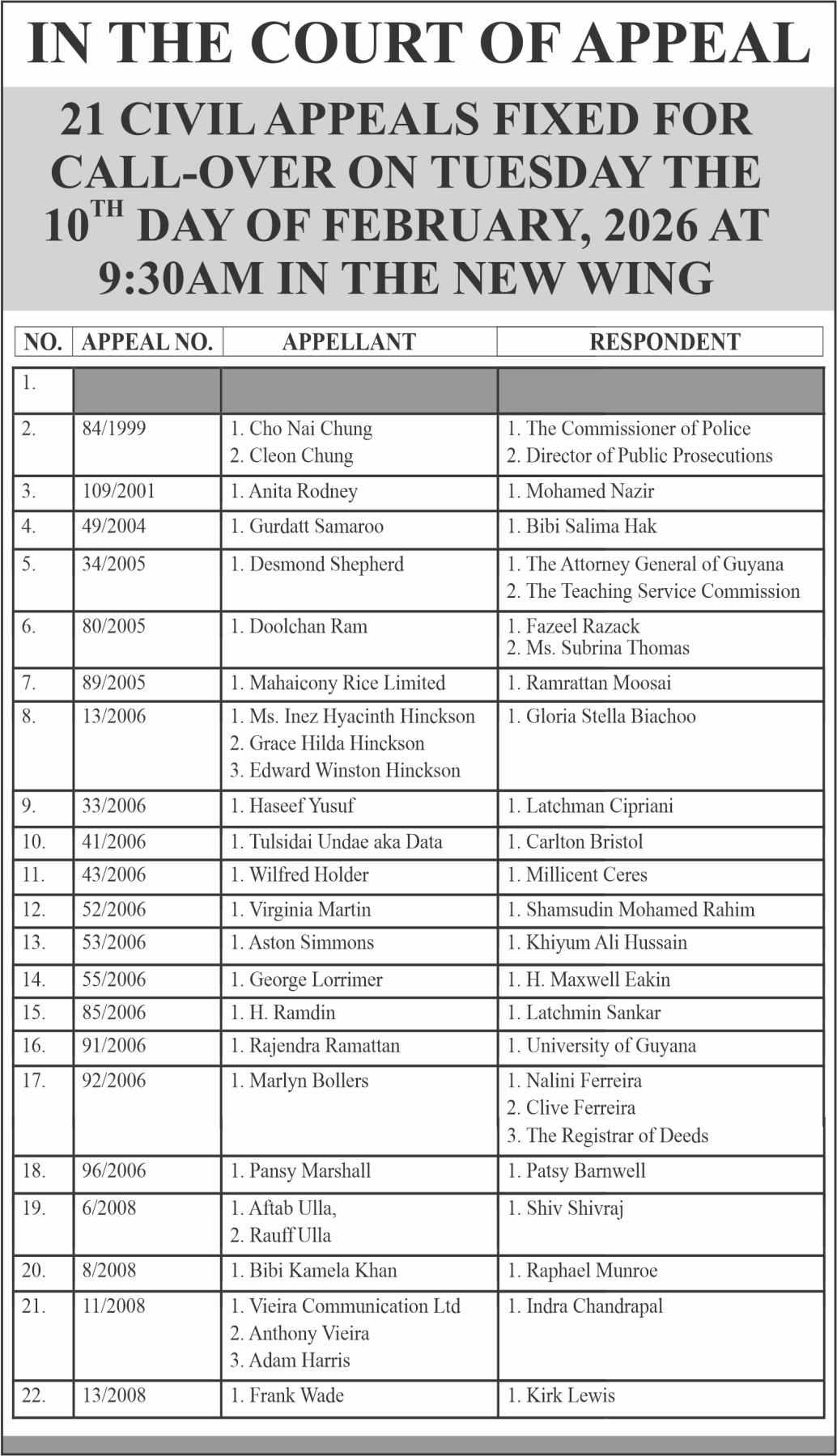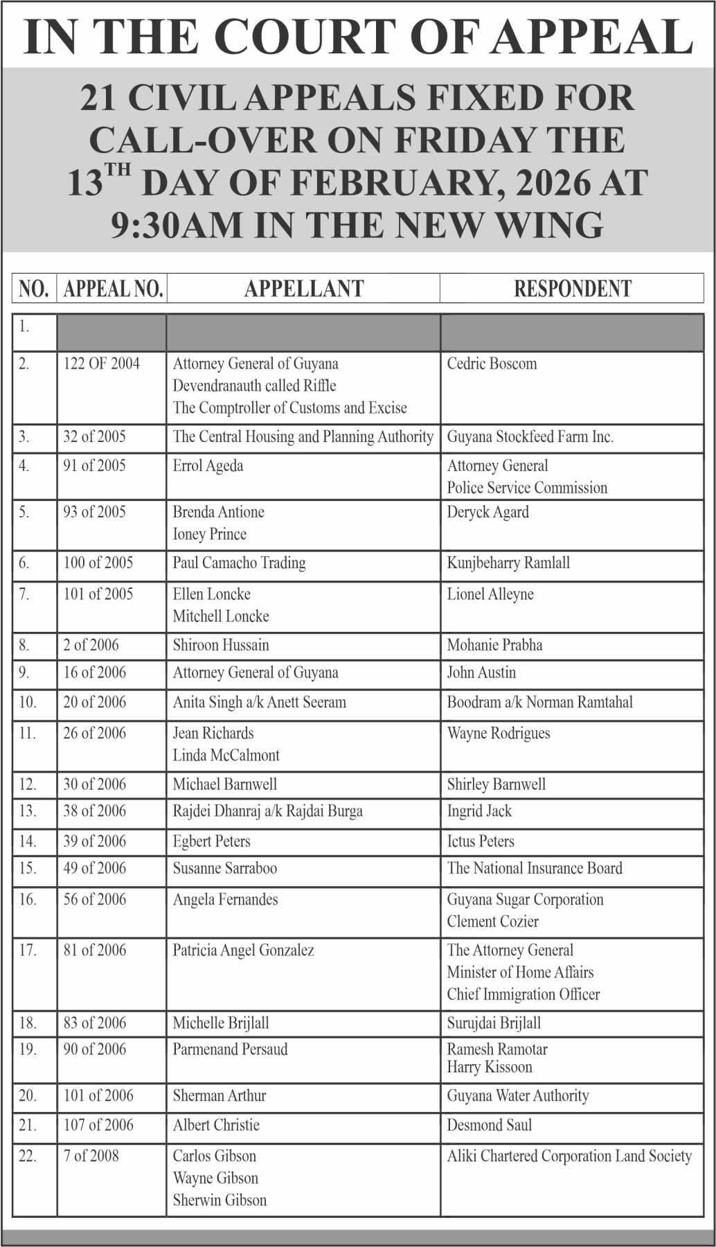 AND TAKE NOTICE if you desire to defend this action you must forthwith within twenty-eight (28) days after the second and final publication of this notice,prepare an Affidavit in Defence in Form 10C prescribed in the Civil Procedure Rules 2016, serve it on the applicant’s Attorney-atLaw, Anansa Swain, Attorney-at-Law for the Applicant, whose address for service and place of business is C/o Guyana Water Incorporated, Corporate Complex, Vlissengen Road and Church Street, Bel-Air, Georgetown, Guyana, Tele No. 592-2250471 ext. 2300/2302 Email:anansas@gwi.gy and file it with proof of service at the Registry of the Supreme Court at Georgetown, Demerara, not later than 4 days before the date fixed for hearing of the application, and you or your Attorney-atLaw must appear at the hearing.AND FURTHER TAKE NOTICE that if you fail to file such affidavit and or if you fail to appear at the hearing, final judgment may be given against you notwithstanding your absence.IT IS FURTHER ORDERED that this matter stands adjourned to the 20th March, 2026, at 10:30 am. FOR REGISTRAR Dated this 21st day of January, 2026