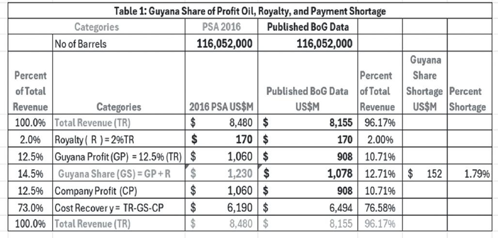 Furthermore, since Guyana only received a total of US$1.077 Billion and total revenuewasUS$8.5Billion, this implies that Guyana's shareoftotalrevenueisonly 12.71 percent, instead of 14 5 percent, assuming maximum 75 percent cost recovery as stipulated in the 2016 PSA (Table 1) Additionally,thebold (Continuedonpage6)