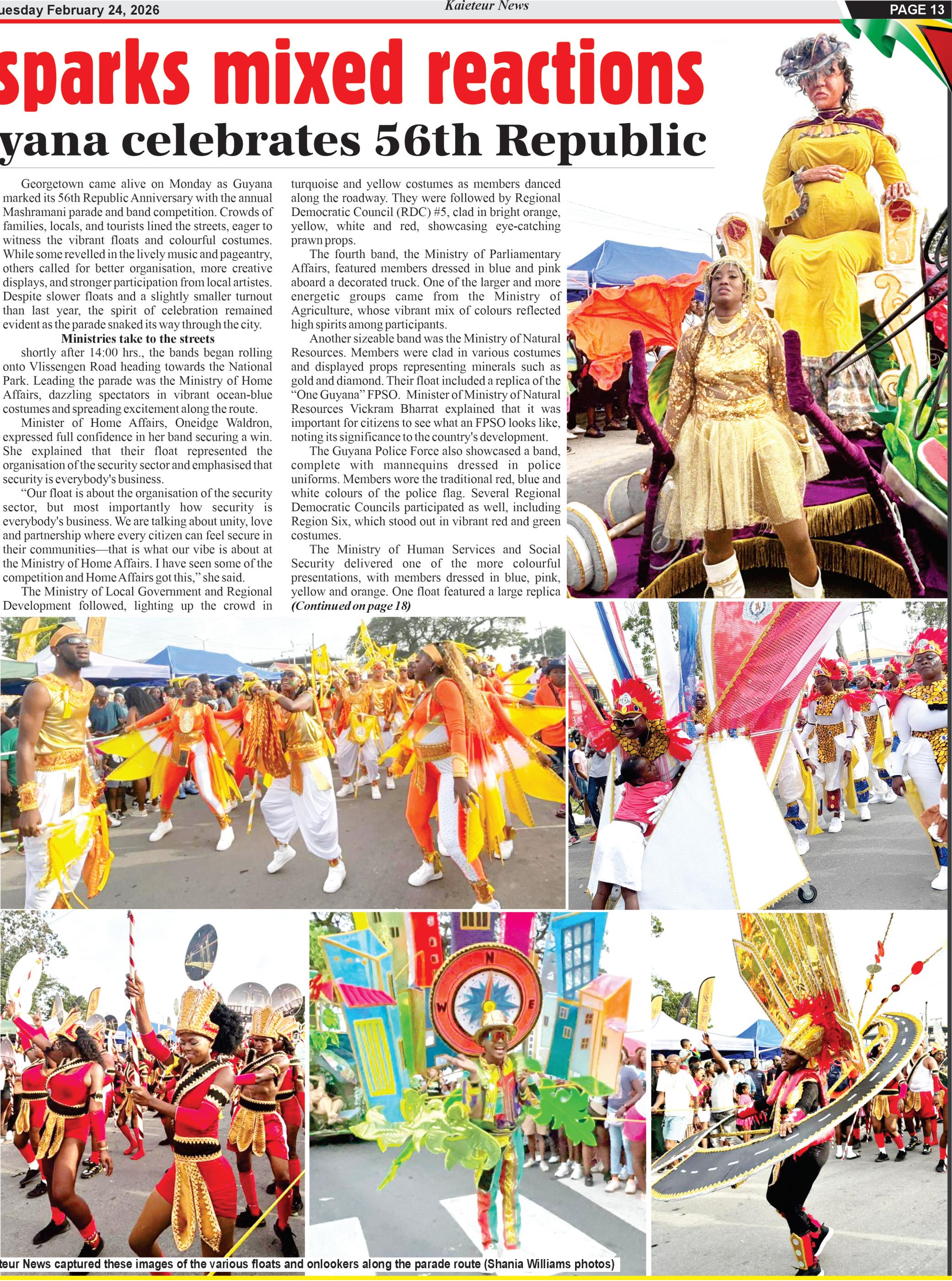 Fifty-sixyearson,theGoldenArrowheadstillrisesagainst the February sky, fluttering above government buildings, village offices, schools and homes. Beneath it stands a peoplewhosehistoryislayeredwithstruggle,sacrificeand survival. From the sugar estates that bore the sweat of indenturedlabourersandenslavedAfricans,totheriverain and hinterland communities where Indigenous citizens continue to safeguard ancestral lands, Guyana’s story is one of resilience forged in diversity Republic status was notsimplyaconstitutionaladjustment.Itwasadeclaration ofconfidence.In1970,thecountryassertedthatitsdestiny wouldbeshapedinGeorgetown,inLinden,inBerbice,in EssequibonotinLondon.