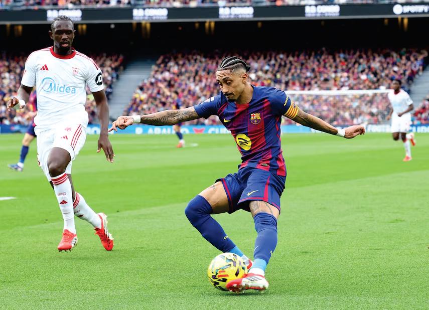 B A R C E L O N A , (Reuters)-Raphinhastruck a hat-trick, including two ice-cool penalties, as Barcelona swept aside Sevilla 5-2 on Sunday to remain four points clear at thetopofLaLiga.