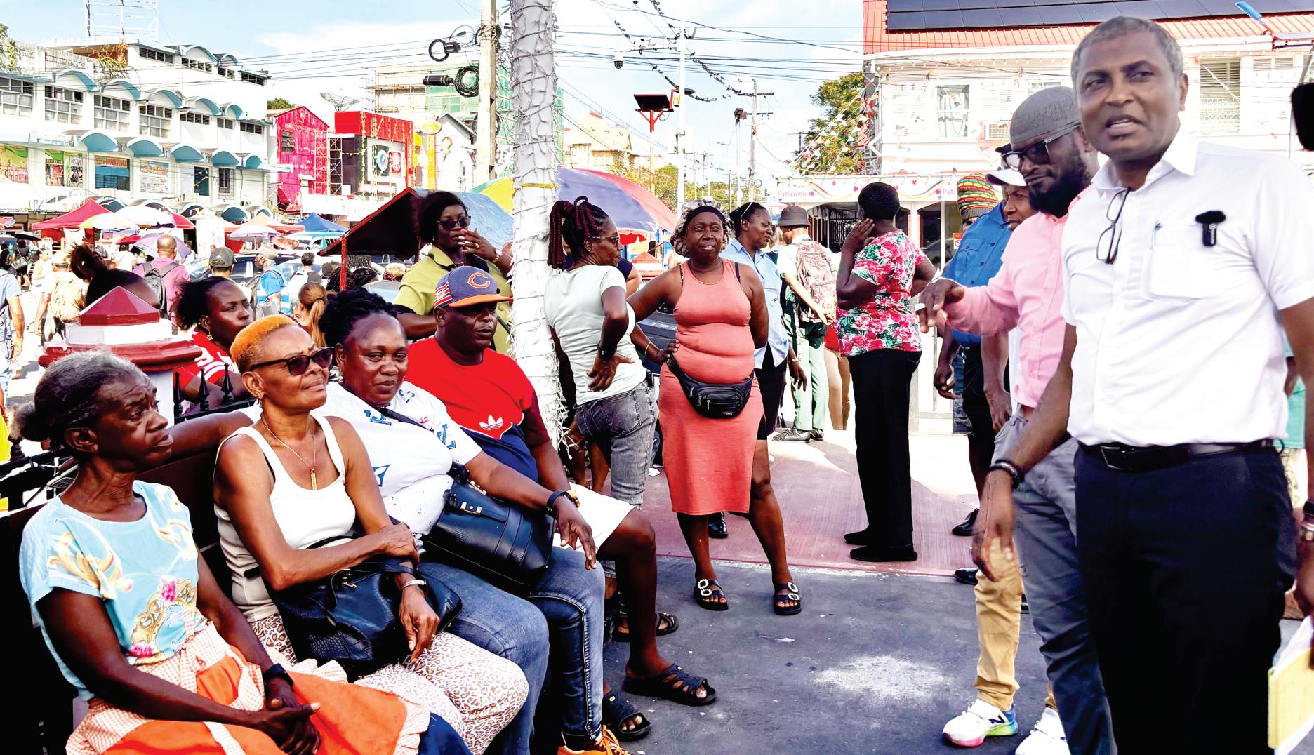 City Mayor Alfred Mentore speaks with vendors at the Stabroek Market Square.