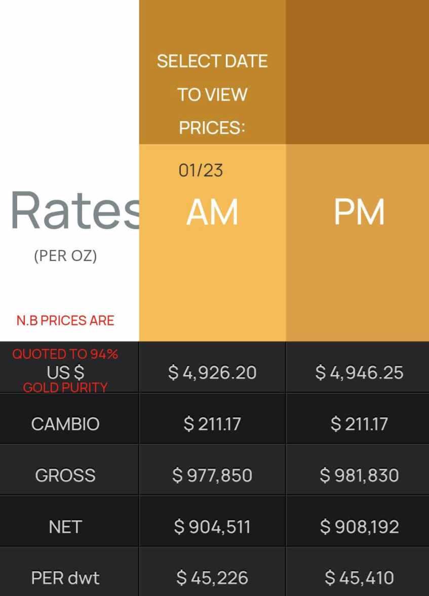 By January 23, gold had climbed to a new high, edging close to the US$5,000 per ounce Morningpriceswerelistedat US$4,926 20 per ounce, r i s i n g f u r t h e r t o US$4,946.25 per ounce in the afternoon. The per dwt