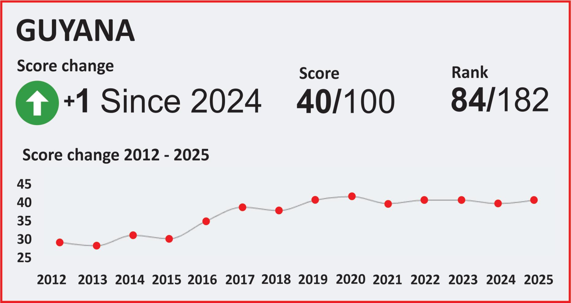 Guyana has improved by a point on Transparency International’s(TI)2025CorruptionPerceptionIndex(CPI). Within the PPPC Government that single point movement maybecelebratedasmajorprogress. Itismorethana33% improvement when compared to this government’s own recordthatitleftbehindin2015whenitwas removedfrom office. The PPPC Government’s CPI score then was below 30, a number so dismal that it should disturb any citizen concerned about corruption and the tsunami of skullduggeriesthatdamageconfidenceandrentatthefabric of governance. The point could be made, a valid one we think, that massive corruption within the ranks of the PPPC ten years ago led to it being booted out of office. Serious leaders who honestly care about corruption, who hate the blotches it leaves on attempts at clean governance, and the stainsagainsttheirownnameswouldbeunsparingofcorrupt actsandcorruptfriends. It’showtheydemonstratethatthey aregenuineaboutdiggingoutcorruptionroots.