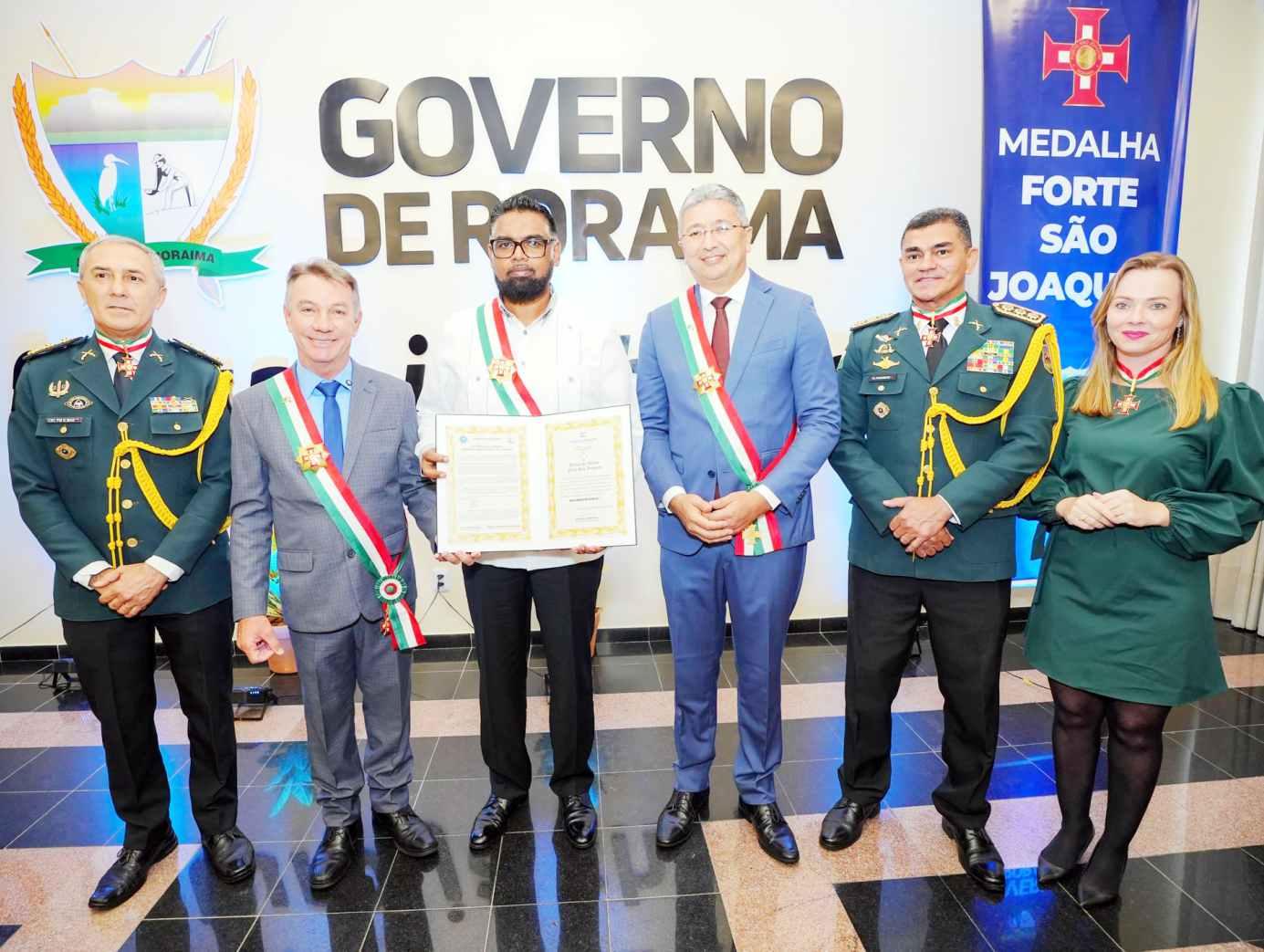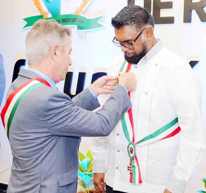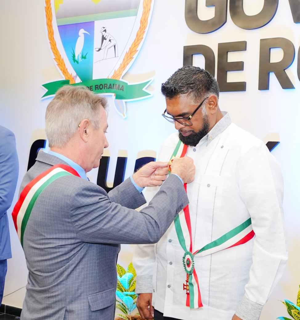 President Irfaan Ali being awarded by Roraima Governor Antonio Denarium.