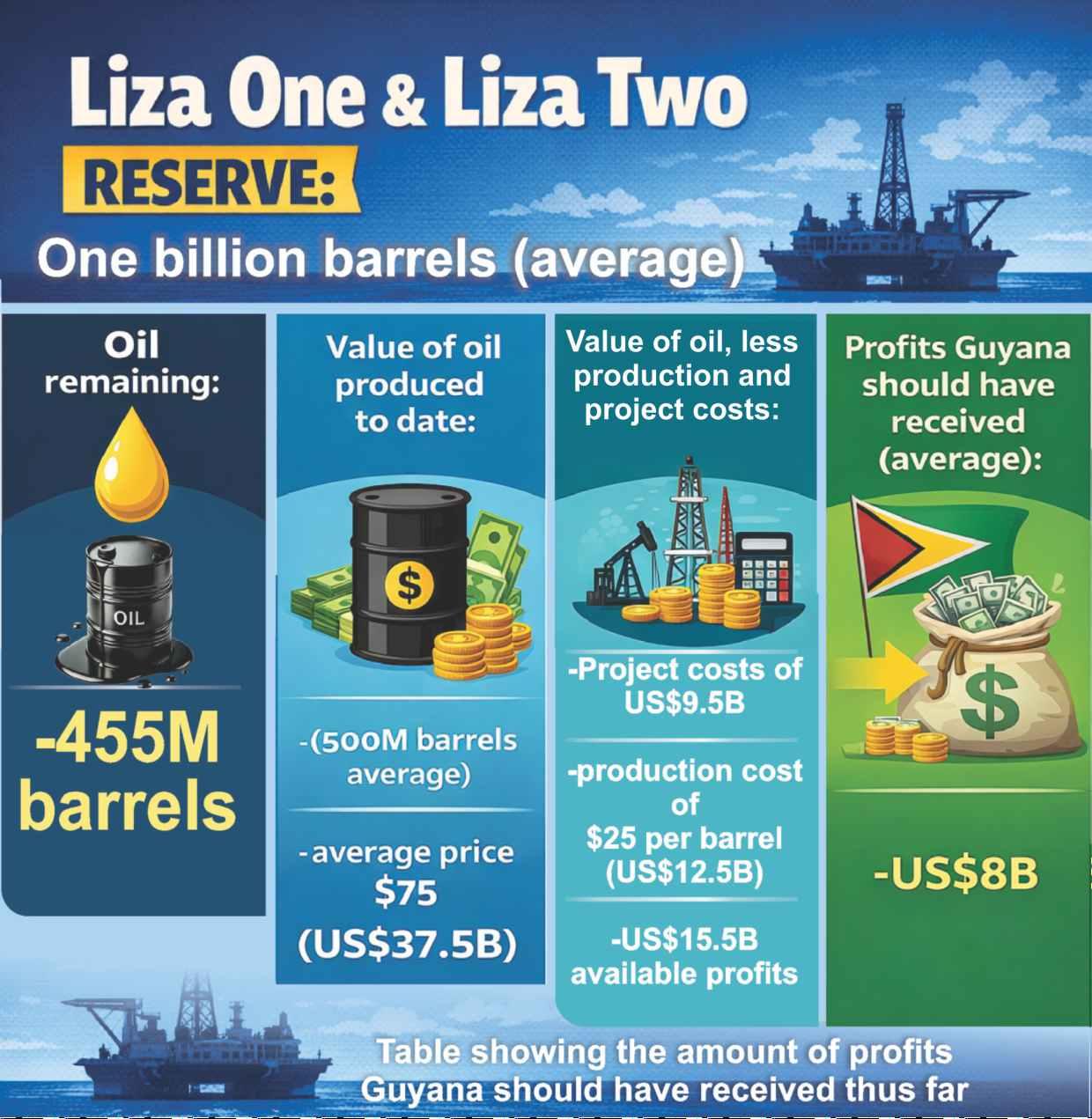 Receipts published by the Bank of Guyana reveal that during the year 2025, G u y a n a e a r n e d approximately US$2.4B in oil revenue, inclusive of profits, royalties and a US$15M signing bonus, paid by oil and gas companies for a Shallow Waterblock.