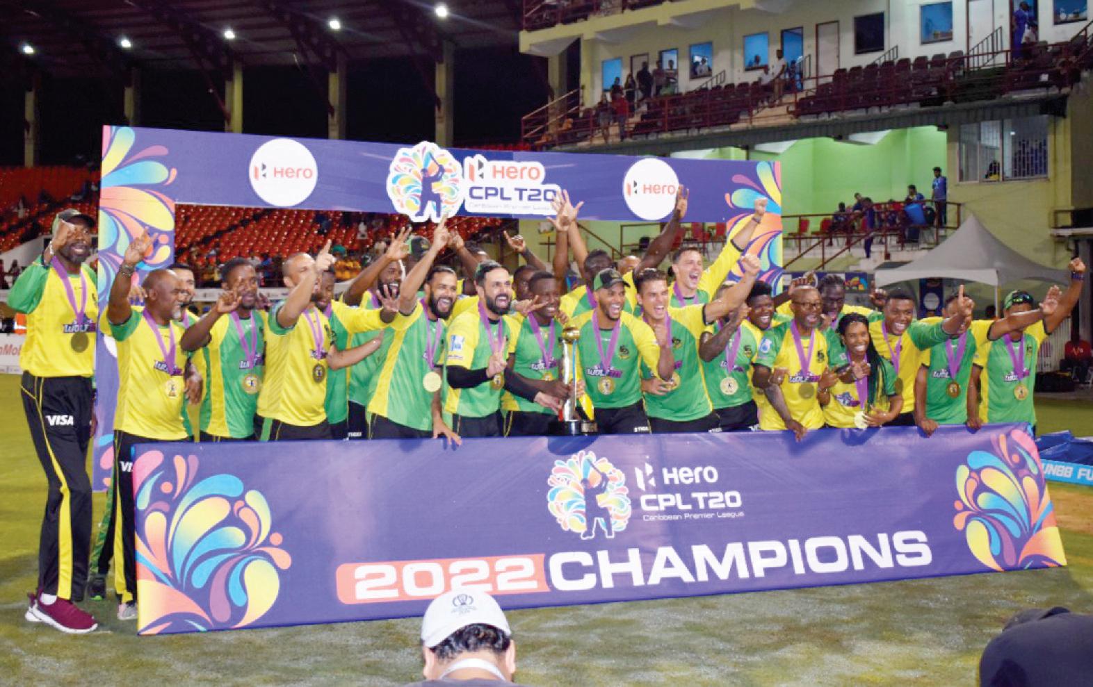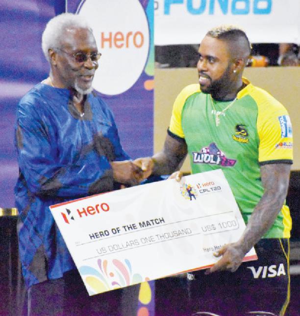 Jamaica Tallawahs celebrate after the presentation. (Zaheer Mohamed) FabianAllen collects his Hero man-of-the-match prize from former Jamaica PM PJ Patterson. (Zaheer Mohamed photo) Azam Khan made 51 for Barbados Royals. (Zaheer Mohamed photo)