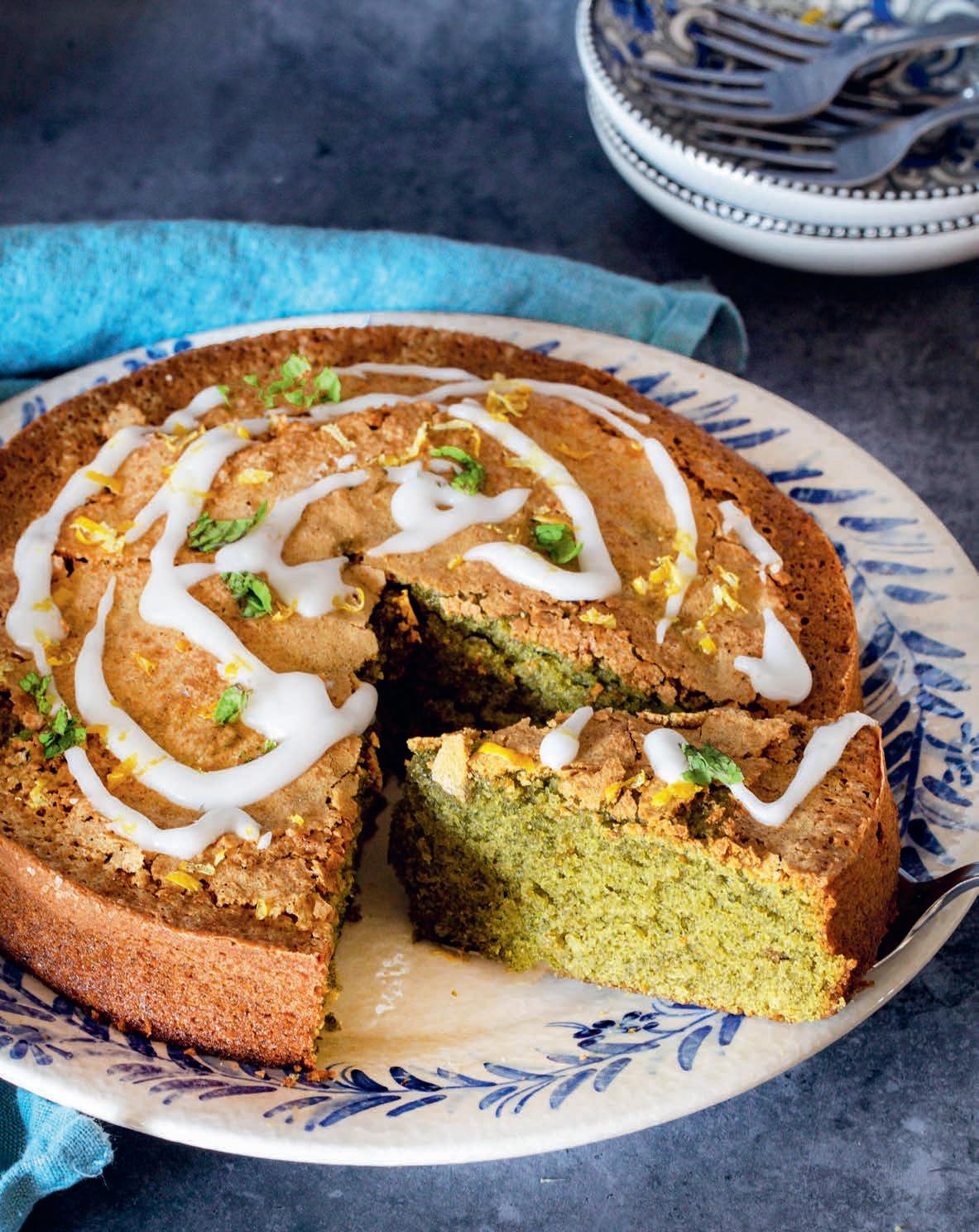 Bruk en kjøkkenmaskin eller håndmikser og en annen bolle til å vispe sammen egg, sitronskall og sukker i ca. 5 minutter, til blandingen er tykk og luftig. Mens mikseren går, tilsett olivenoljen sakte i en stråle. Ha i mynte-melken og sitronsaften, og miks til alt er godt blandet. Tilsett de tørre ingrediensene til eggeblandingen og visp til alt akkurat er blandet. Unngå overmiksing. Hell røren i den forberedte kakeformen, og strø over 1–2 ss sukker. Bak kaken i ovnen i 30–35 minutter eller til den er ferdig. La kaken avkjøle i formen i noen minutter før du forsiktig tar den ut og lar den avkjøles helt på en rist. Server kaken som den er, eller med en lett glasur eller krem om ønskelig.