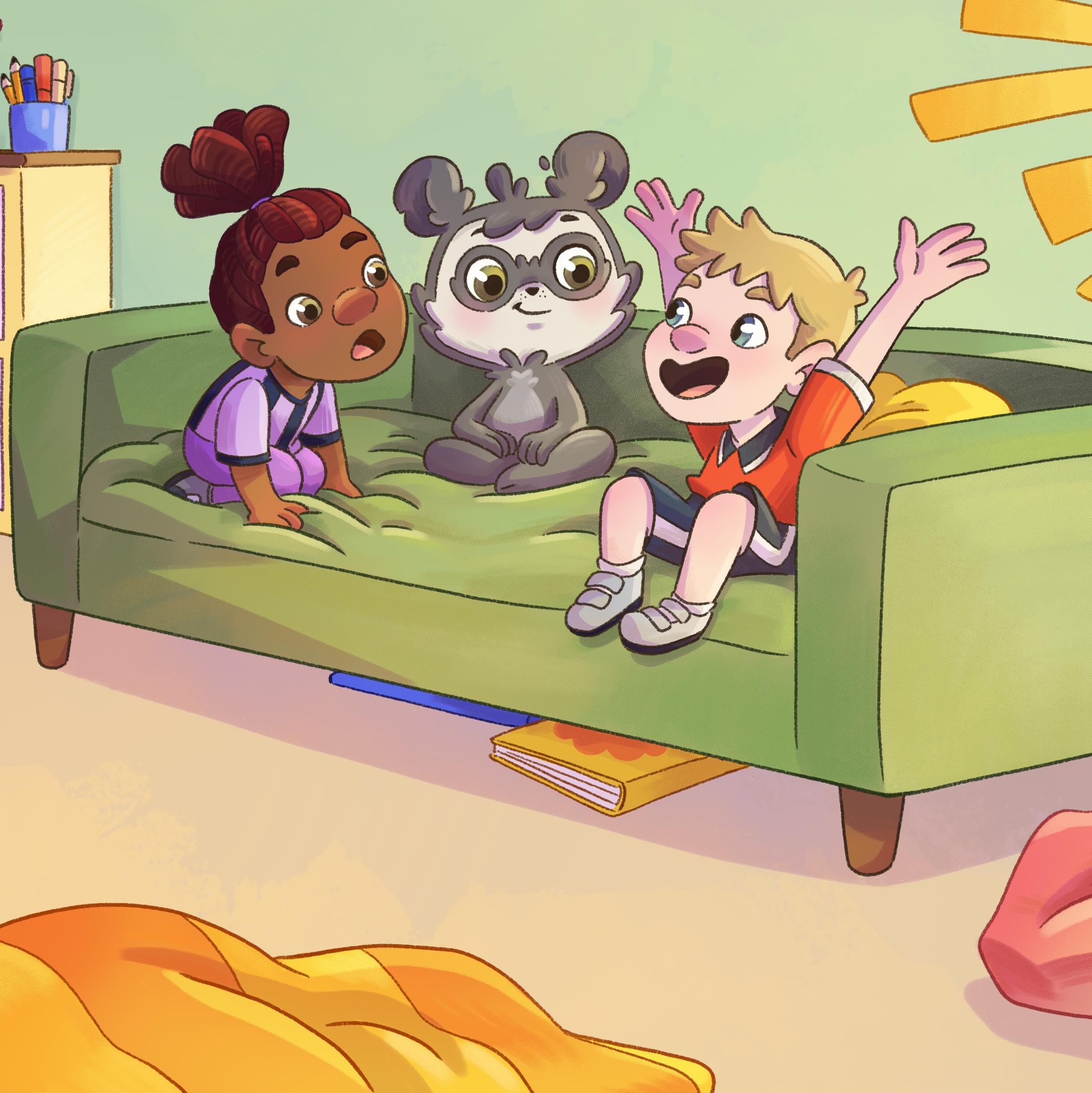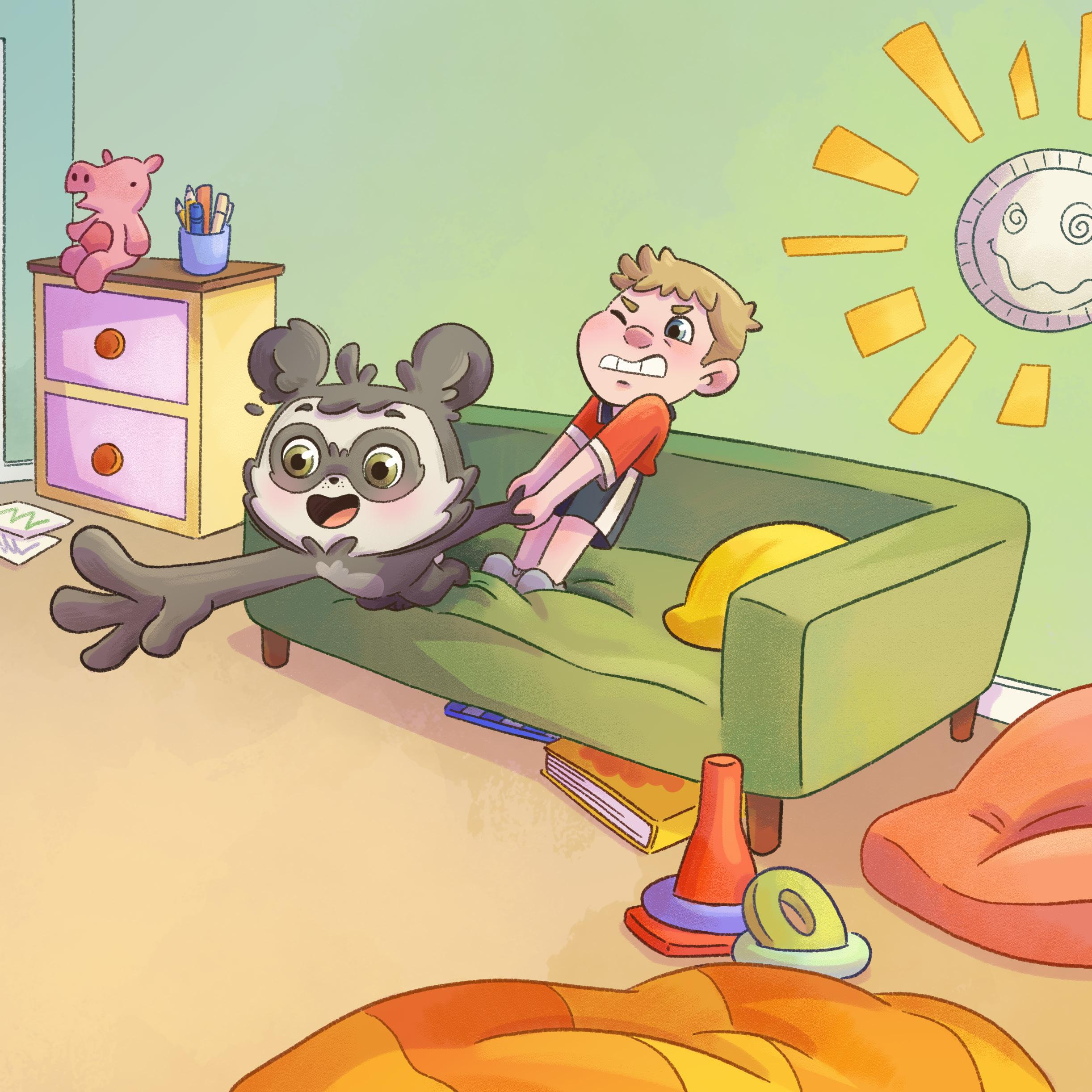Thor holder seg fast i sofaen, og Brillebjørn tar tak i den andre hånden hans.
