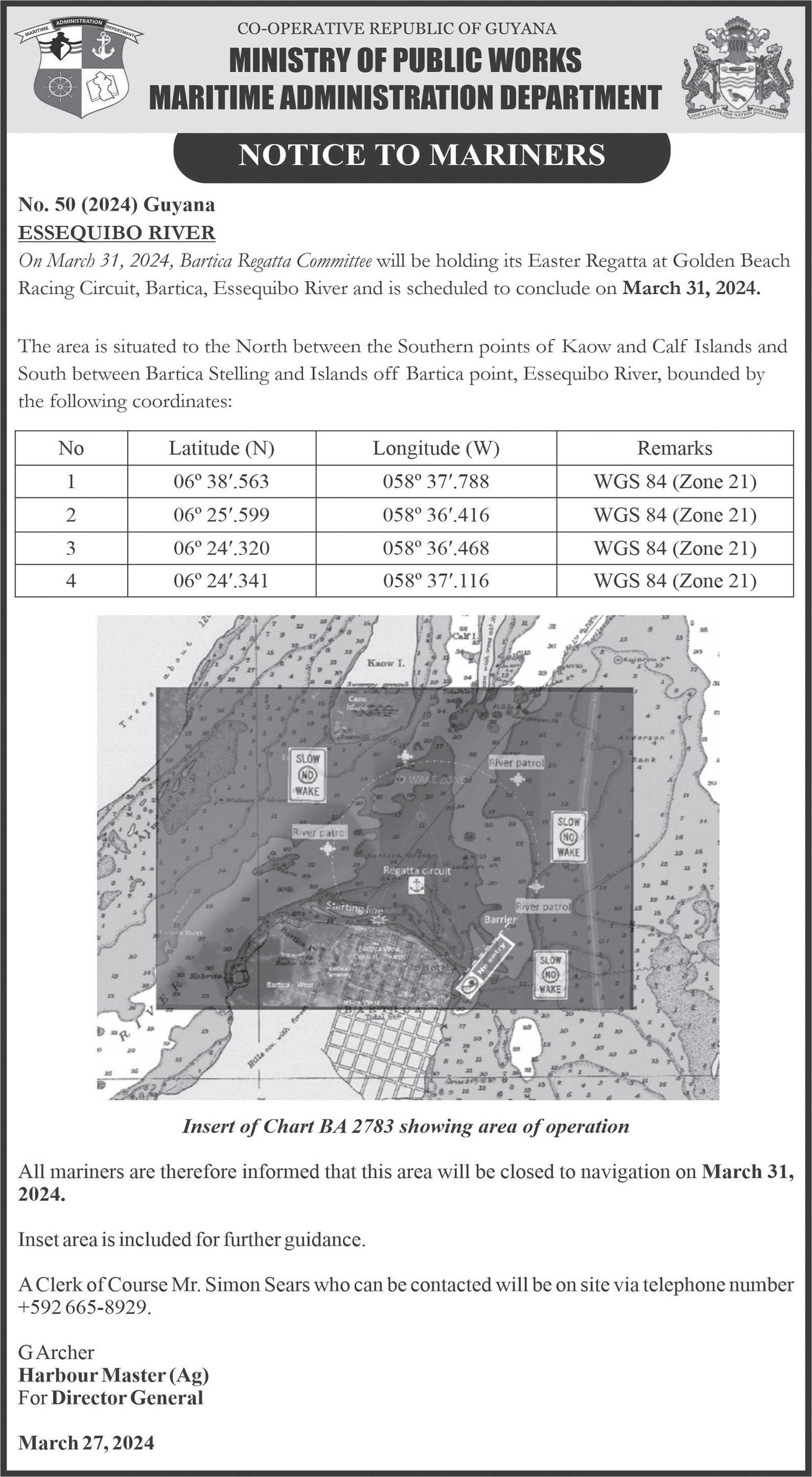 All races would be run under the guidance of the Guyana Horse Racing Authority rules, and races are subject to change. Only jockeys with less than five (5) wins for year 2023 will be allowed to ride in the ‘L’ Class and J3 maiden rac-