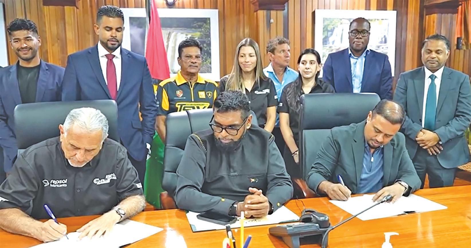 As the South Dakota Circuit at Timehri undergoes massive transformation, Guyana’s hosting of the third leg of the GT Challenge de las Américas was set in stone on Wednesday, with an agreement signing at the Office of the President. Head of State, President Dr Irfaan Ali; Sport Ministers Charles Ramson Jr and Steven Jacobs; and Minister of Public Utilities and Aviation Minister Deodat Indar looked on at the auspicious moment as the Guyana Motor Racing and Sports Club (GMRSC) inked a five-year deal with