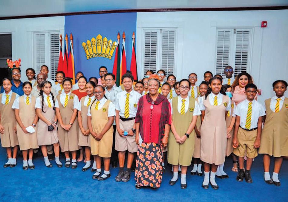 His Excellency President Irfaan Ali and First Lady Mrs Arya Ali were on Tuesday evening serenaded by students of the Queen's College Choir at State House. The 35-member choir was led by Ms Gem Rohlehr, who has been teaching music at that school since 1988.