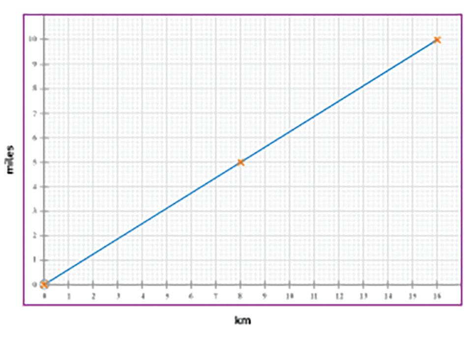 1. The graph shows the conversion between kilometres and miles. Use the graph to estimate the number of miles equivalent to 6km.