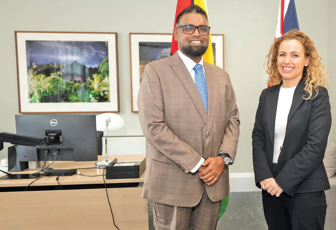 The UK Minister commended Guyana for keeping its forests standing, which cover 85 per cent of the country, without hindering the nation’s development – something President Ali credited to its low Carbon Development model that was crafted and introduced under the Bharrat Jagdeo presidency.