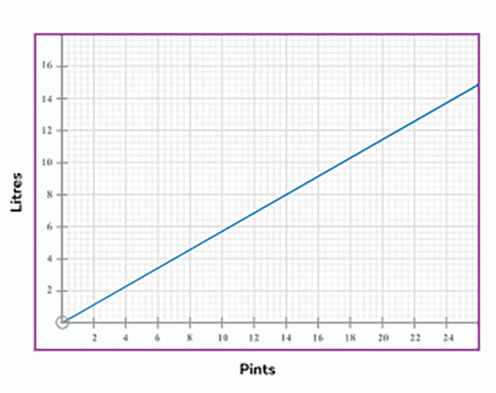 4. The graph shows the conversion between pints and litres. Use the graph to estimate the number of litres equivalent to 14 pints.