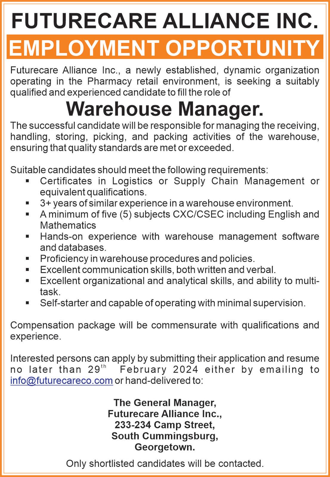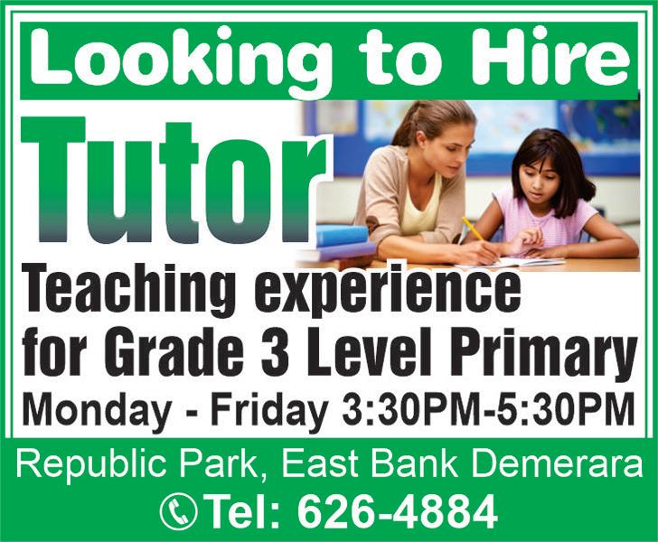 29 CLASSIFIED ADS WANTED One night security and one handyman 7 days per week Call 612-2125 VACANCY Vacancy exists for Cook/Pastry Assistant. Please call: 600-4968. FOR RENT South Ruimveldt Park. 3 Bedroom Upper Flat fully air conditioned, unfurnished apartment, water included. $240,000. Secured Parking. Tel.: 676-8805 or 609-8805.